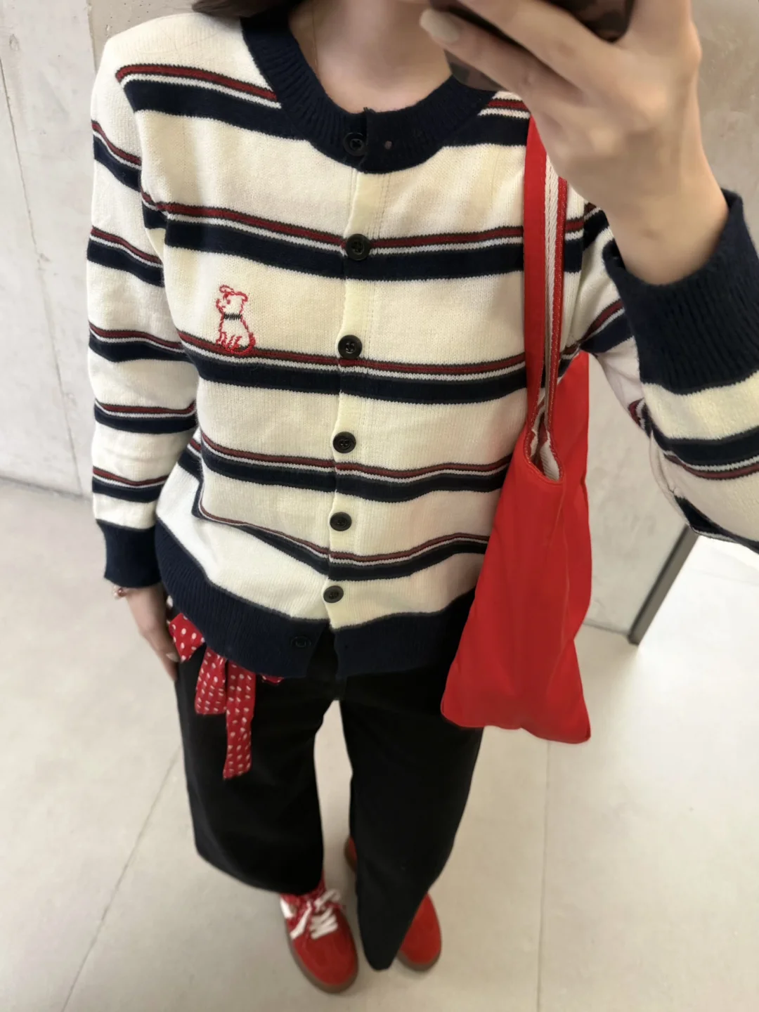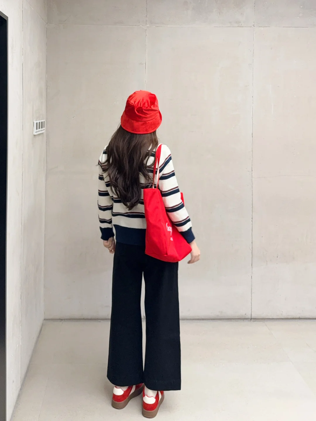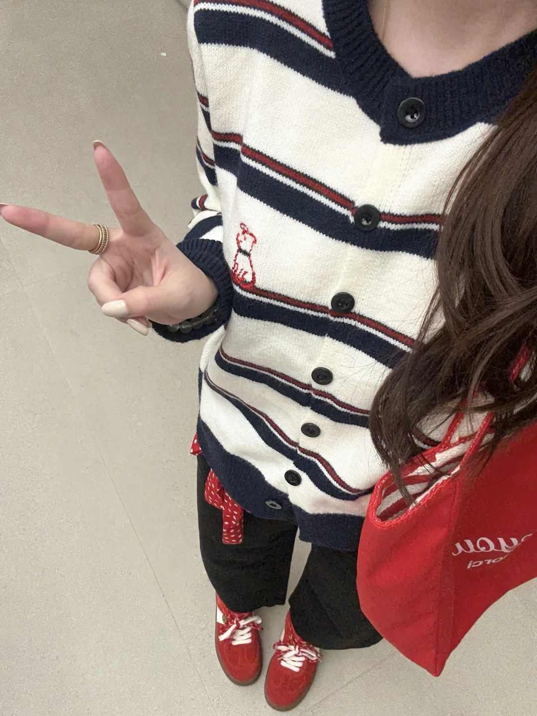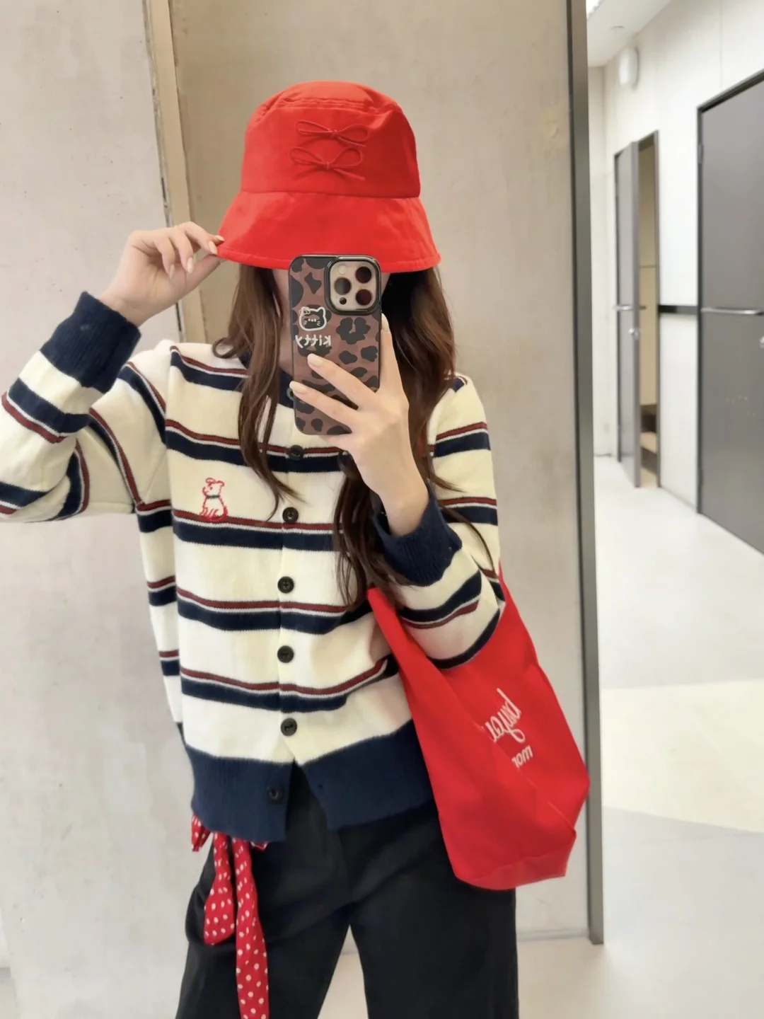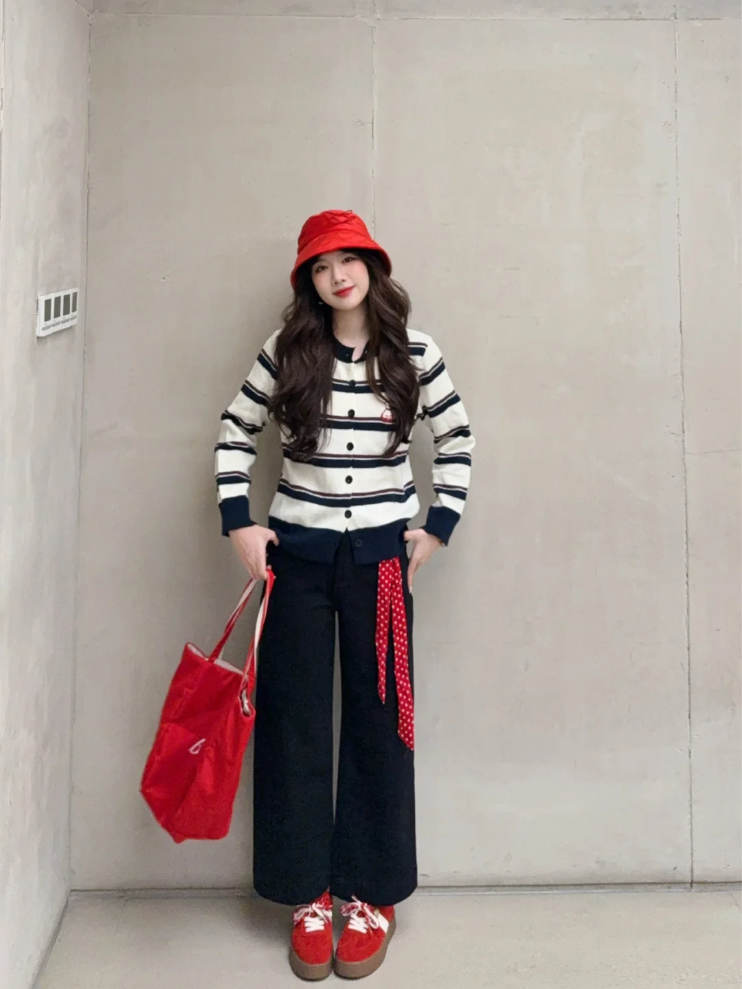 168/106 纯分享 理性种草~ 一套日常又带点miu感的搭配 最近这个条纹开衫还蛮火的 单穿或者当内搭都挺好看的~ 可以搭配蓝色黑色卡其色藏青色的下装(裙子裤子都可以) 想要更慵懒一些可以搭配拖地裤 配饰搭配红色比较出彩~ 这套应该没人会说裤脚弄脏了吧哈哈哈 九分裤真的很利索 看起来腿很直~