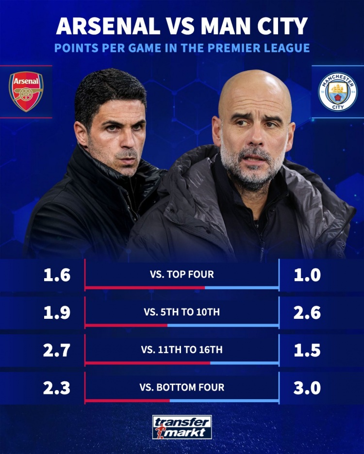 直播吧2月25日讯在多赛一场的情况下,英超领头羊阿森纳目前仅领先位居次席的曼城5分。如今,英超冠军之中越来越激烈。德国转会市场盘点了两队面对其他英超球队时的积分情况。