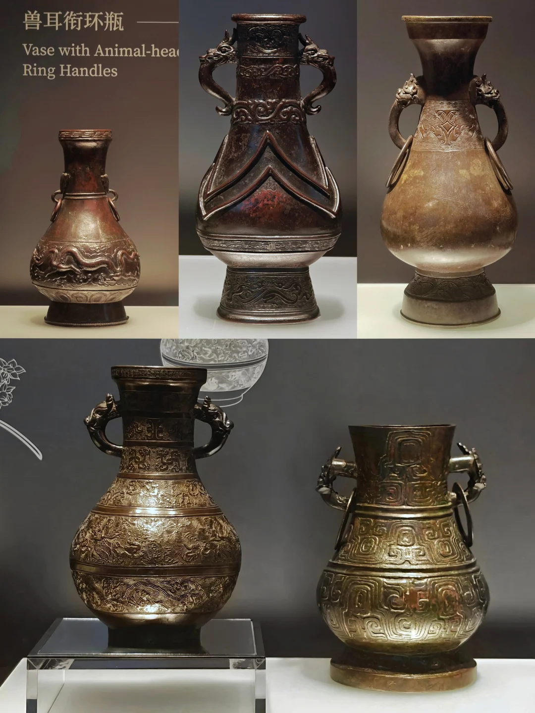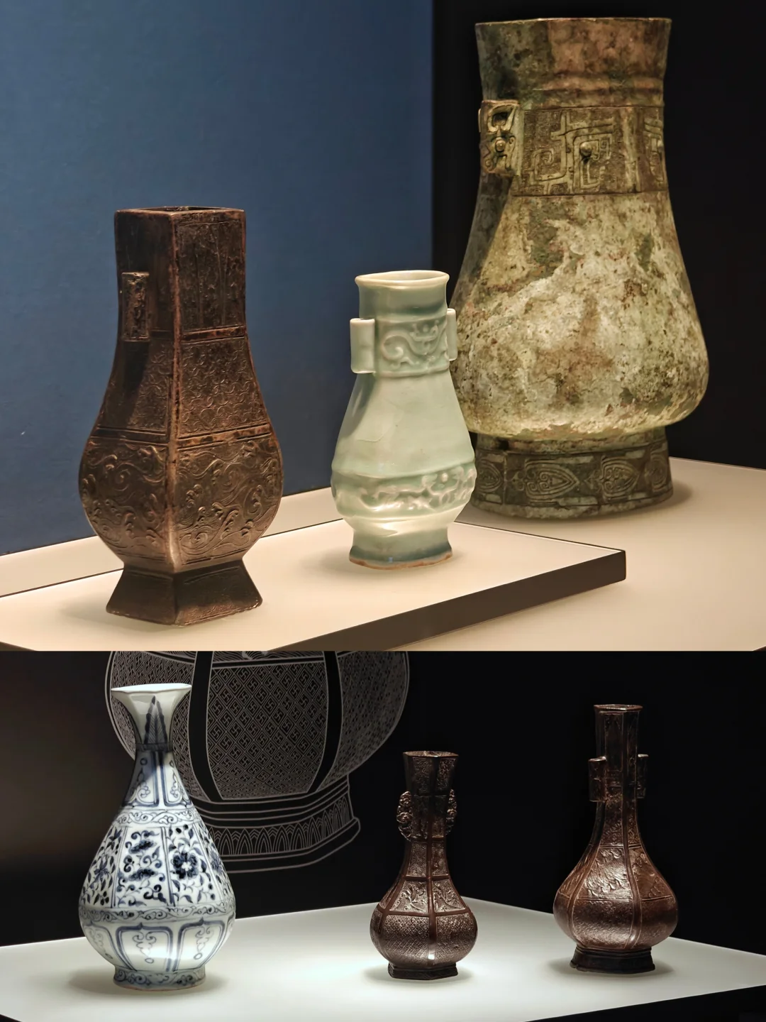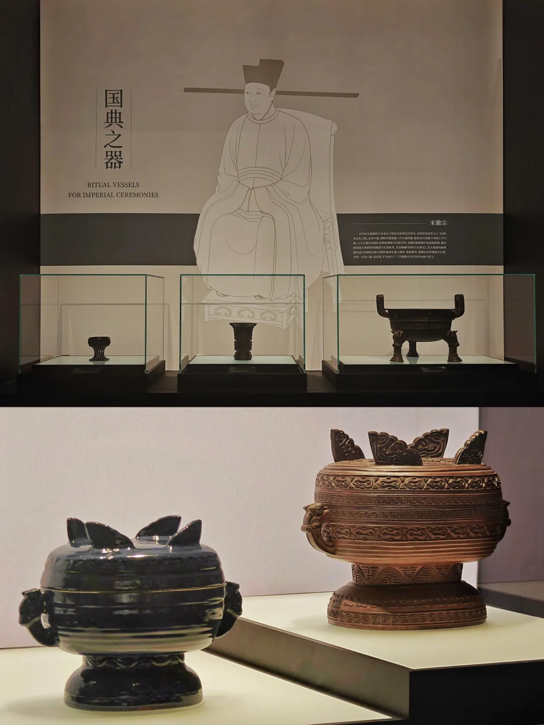 🟤并置与对话:宋徽宗与清高宗两帝对望;春秋时期者减钟与鎏金仿古铜“姑洗”钟;琮式瓶的功能演变;相同功能不同材质器物的对照;乾隆双凤壶与法国仿品的中西对照