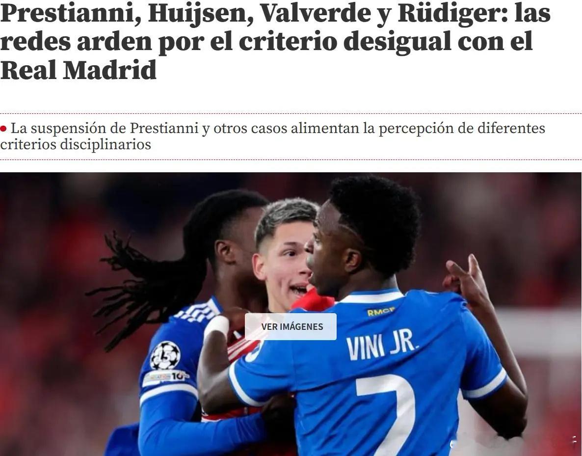 《世界体育报》强调欧足联在尚未获得足够证据的情况下就对普雷斯蒂安尼进行临时禁赛,且无视了巴尔韦德的暴力动作。另外,皇马球员吕迪格曾多次做出争议挑衅动作,但总能逃过处罚。世体强调:“很多人都说:因为是皇马,所以标准就变了。”