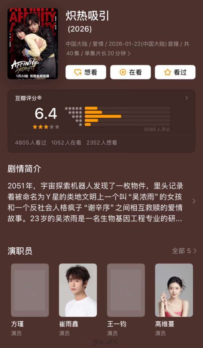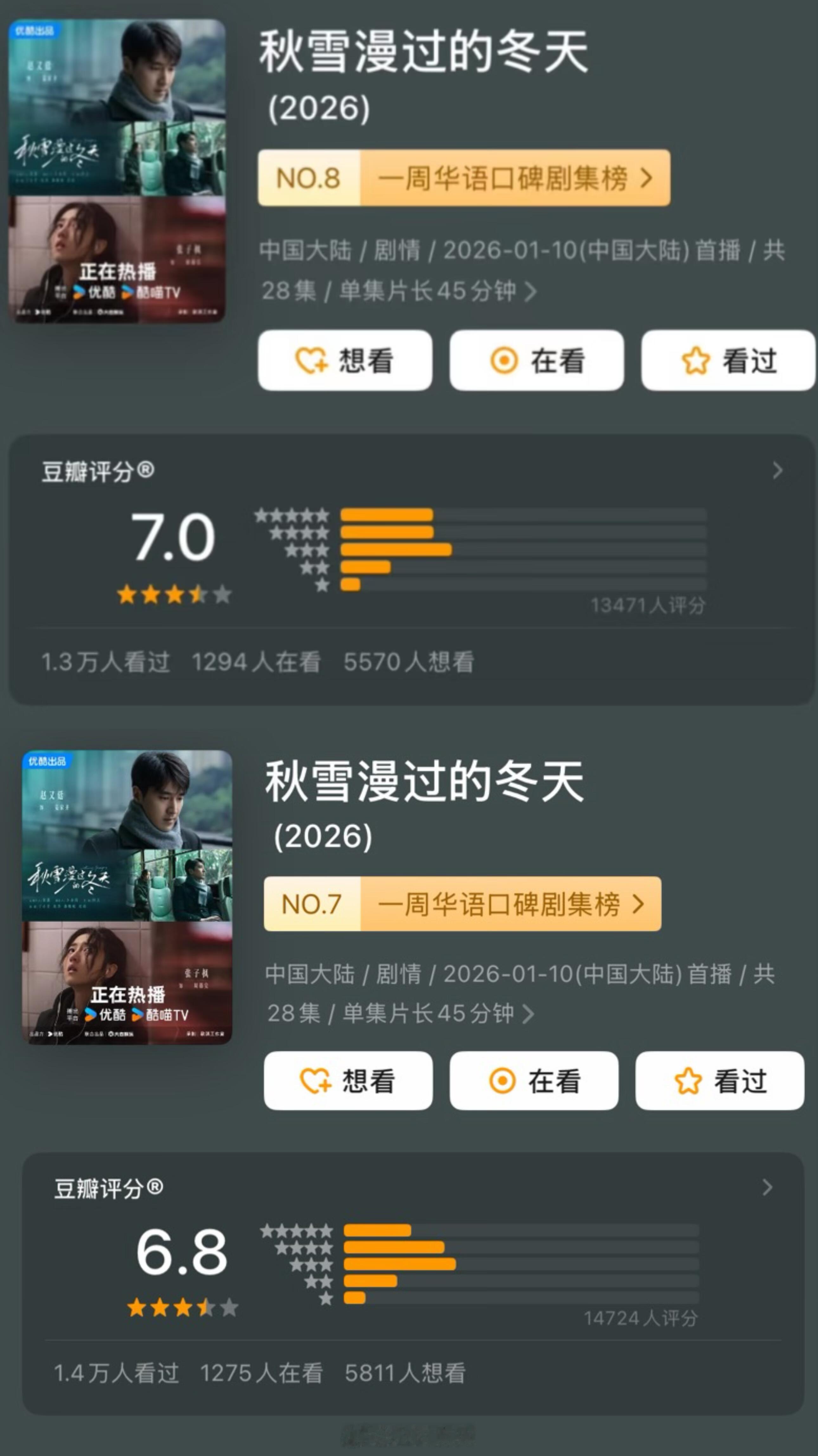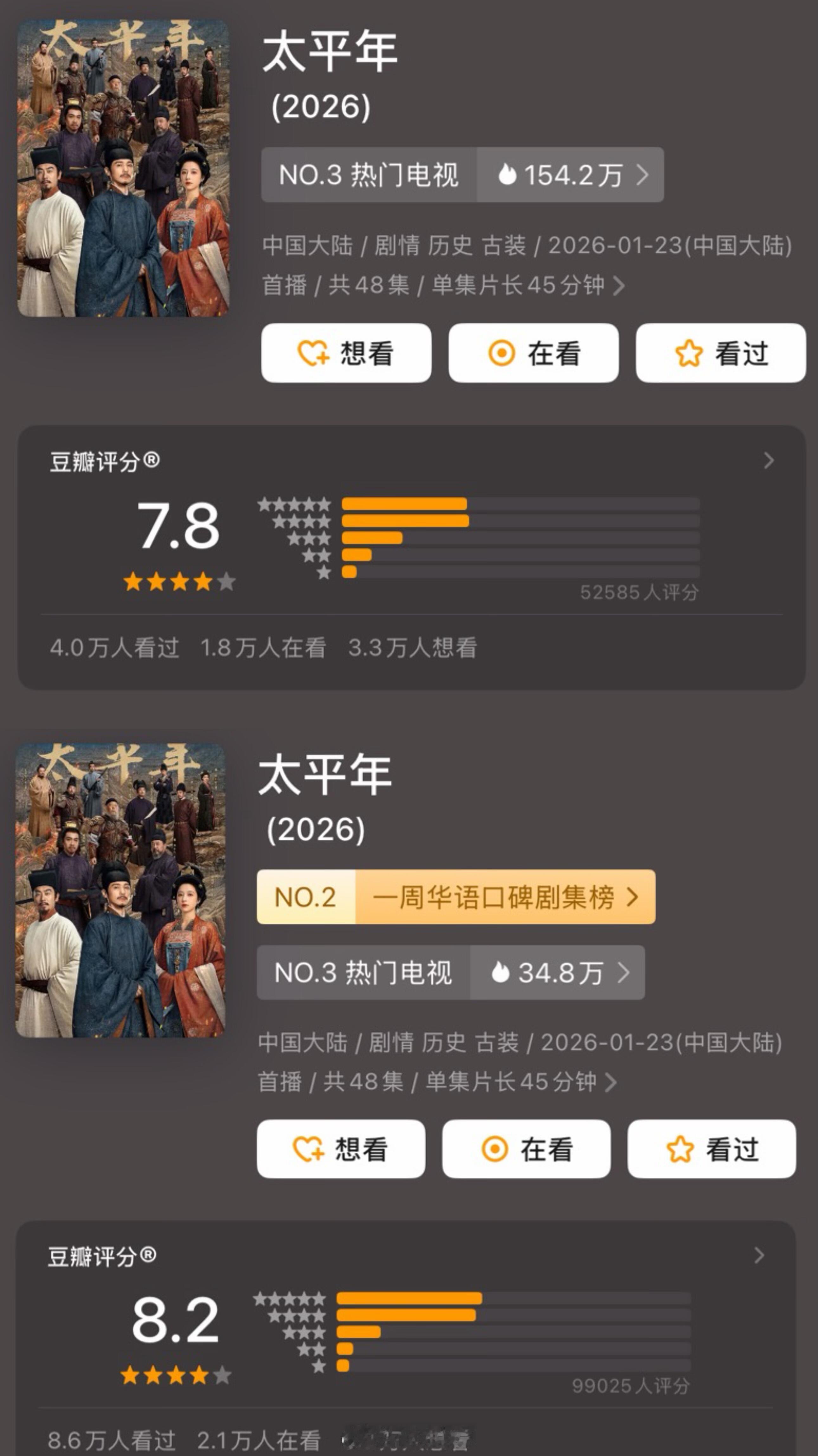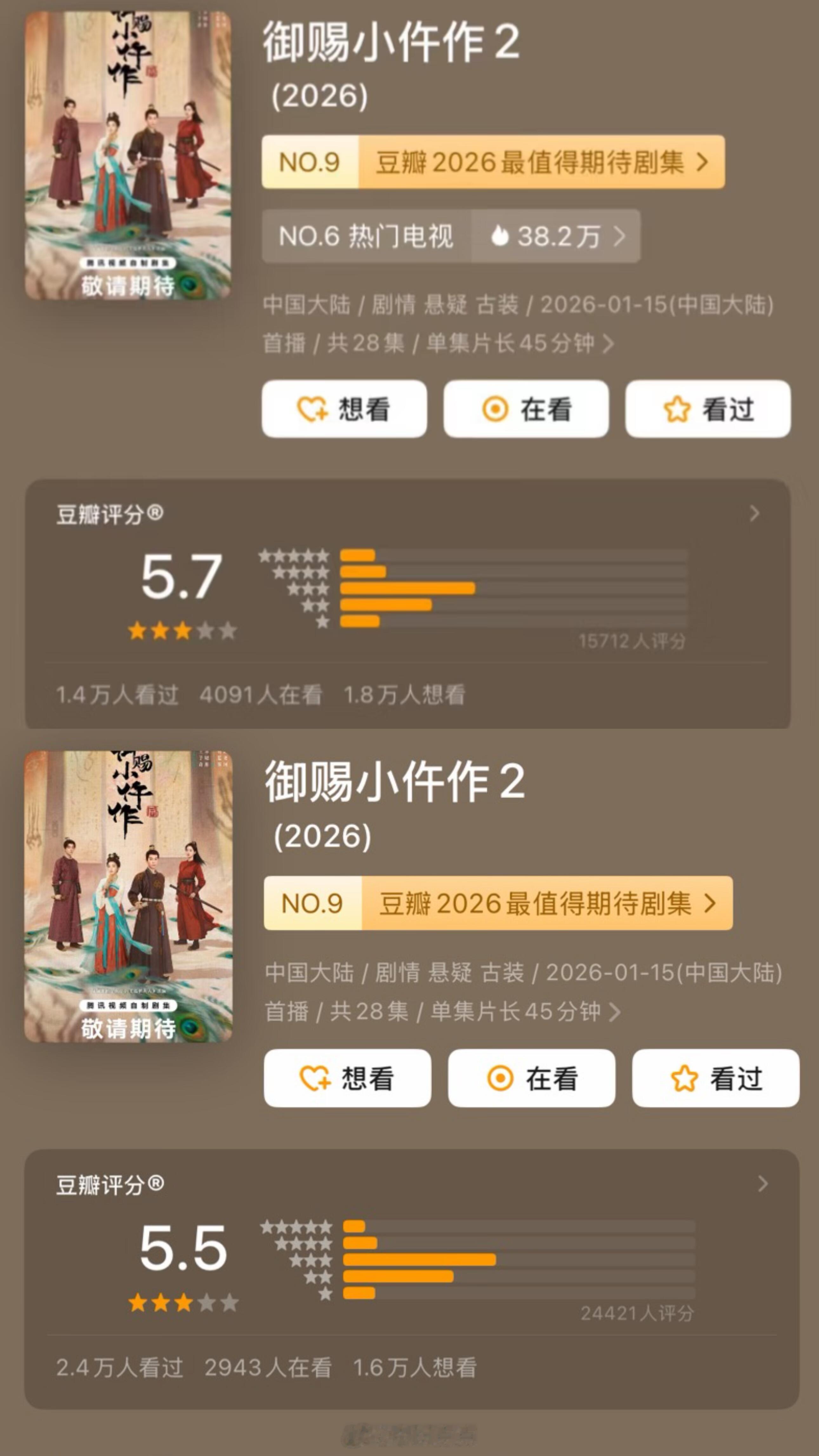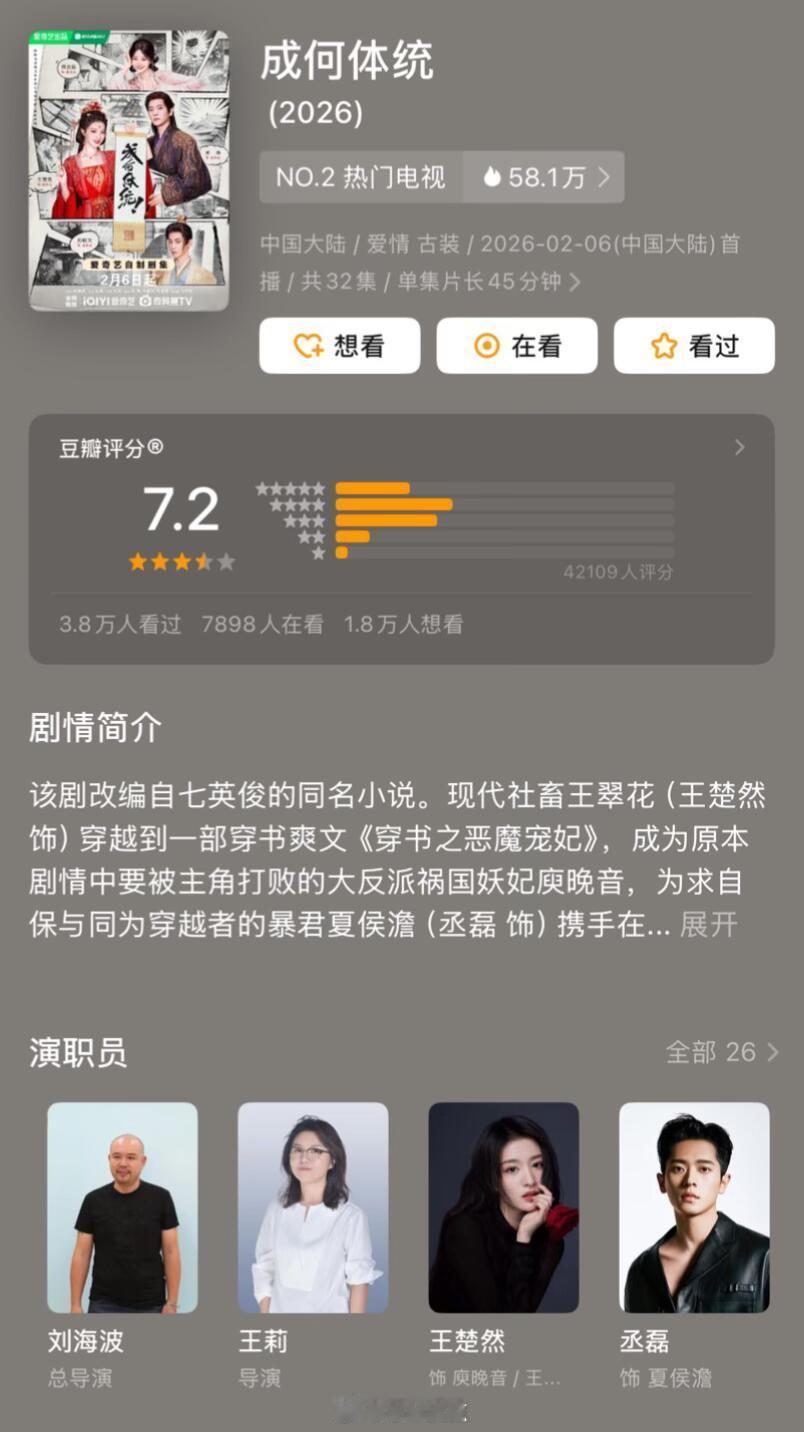 近期6部剧评分‼️2026年2月《成何体统》开分7.2分(合格的古偶 在古偶里面算高分了 )2026年1月《生命树》开分8.1分→8.3分(已经近27万人打分,真口碑好剧🌳口碑剧集榜no.1 )《太平年》开分7.8分→8.2分《御赐小仵作2》开分5.7分→5.5分《秋雪漫过的冬天》开分7.0分→6.8分短剧《炽热吸引》开分6.4分ps:近期你在追哪一部剧?欢迎大家一起讨论交流!
