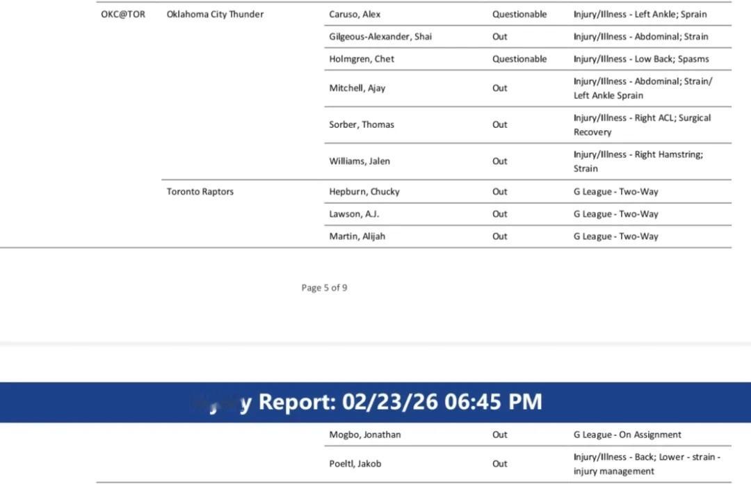 根据伤病报告,切特(背部痉挛)和卡鲁索(脚踝扭伤)出战成疑,亚历山大、杰伦·威廉姆斯、米切尔和索伯继续缺席。猛龙方面,珀尔特尔、莫格博和三名双向均缺阵。
