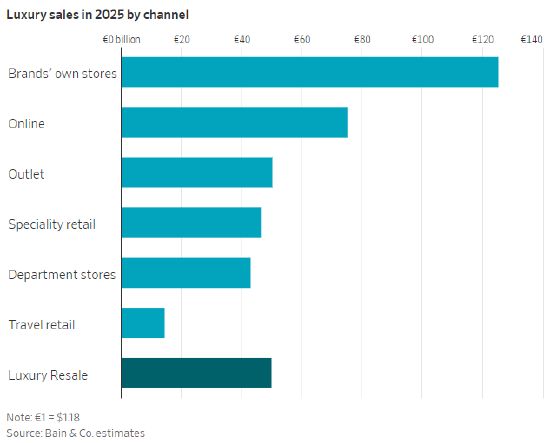 根据贝恩公司的预估,去年奢侈品二手市场规模首次突破500亿欧元(按当前汇率约合590亿美元)。二手业务增速远超一手新品市场,规模已与奢侈品品牌通过折扣店实现的总交易额相当——而折扣店是其第三大销售渠道。