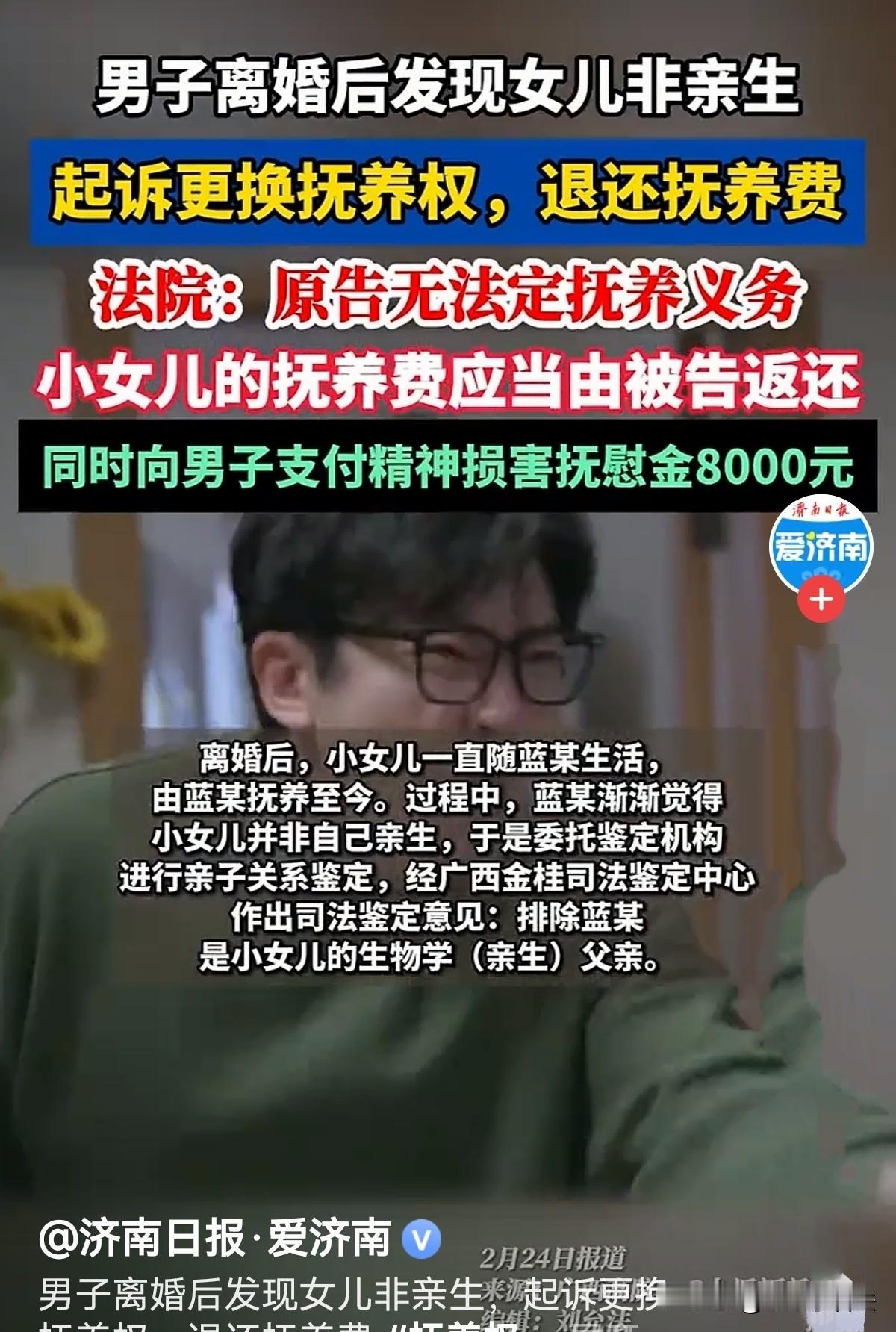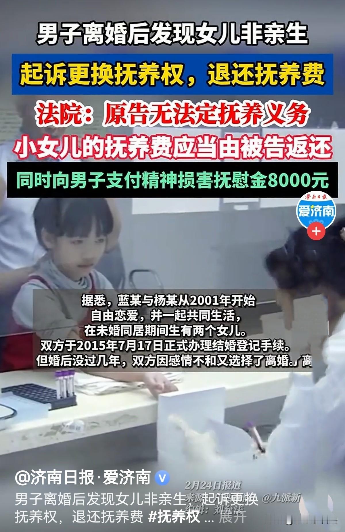 “真欺负人!”广西贵港,一男子与女友同居15年,生了2个女儿后才结婚,谁知结婚几年,两人感情出了问题,选择离婚,两个女儿一人抚养一个。男子抚养小女儿多年后,渐渐觉得小女儿非亲生,于是便带着孩子做了亲子鉴定,结果验证了他的想法,他崩溃了!养了这么多年,疼爱入骨的女儿不是自己的!他愤怒地将前妻告上法庭,要求更换抚养权,退还抚养费并对他进行精神赔偿。法院是这样判的! 在婚姻里,最伤人的不是争吵和分开,而是掏心掏肺付出多年后,突然发现自己一直活在谎言里。 男子蓝某辛苦抚养小女儿长大,离婚后更是独自扛起照顾孩子的责任,可一份亲子鉴定结果,彻底打碎了他多年的付出与期盼。 事情要从20多年前说起。2001年,蓝某和杨某相识相恋,情投意合的两人很快确定了关系,开始了同居生活。 那时候的他们,和所有热恋中的情侣一样,对未来充满憧憬,日子简单又温馨。 在未婚同居的日子里,杨某先后生下2个女儿,一家四口的生活,虽然不算大富大贵,但儿女绕膝的幸福,让蓝某觉得一切辛苦都值得。 在2015年7月17日,两人正式办理了结婚登记手续,结束了长达15年的同居生活,给这段长跑多年的感情,画上了合法的句号。 然而领证结婚后,琐碎矛盾不断累积,曾经的爱意被消磨殆尽,没过几年,这段勉强维系的婚姻还是走到了尽头。 双方选择离婚,经商定两个女儿一人一个,小女儿跟随蓝某一起生活。 从此,蓝某既当爹又当妈,独自承担起抚养小女儿的全部责任。 从衣食住行到读书学习,蓝某事事亲力亲为,把自己能给的最好条件都留给了女儿。 他看着女儿一天天长大,心里满是为人父的欣慰,可随着孩子的样貌渐渐长开,蓝某心里却悄悄升起了一丝难以言说的疑虑。 女儿的五官、神态,和自己没有半分相似之处,身边亲友偶尔无意的一句玩笑,更是像一根刺,扎在蓝某的心里,让他日夜不安。 他不愿意相信这个可怕的猜测,更不敢面对可能到来的真相。 毕竟,这是他疼了多年、养了多年的女儿,是他放在心尖上的孩子。 可内心的疑虑越来越重,无数个辗转反侧的夜晚,蓝某都在挣扎和纠结中度过。 最终,为了求一个真相,也为了解开心里的疙瘩,蓝某下定决心,带着女儿前往广西金桂司法鉴定中心,做了正式的亲子鉴定。 蓝某坐立难安,他既希望结果能证明自己是多想了,又害怕真相残酷到让他无法接受。 当鉴定报告出来的那一刻,“排除蓝某是小女儿的生物学父亲”这一行字,像晴天霹雳一样,狠狠砸在了蓝某的头上。 他多年的父爱、付出、坚守,瞬间都变成了一个巨大的笑话,愤怒、委屈、屈辱、心碎,各种情绪瞬间将他淹没。 他怎么也想不到,自己深爱过的伴侣,会瞒着如此重要的真相;自己倾尽心血抚养的女儿,竟然和自己没有半点血缘关系。 愤怒的蓝某一纸诉状将前妻告上法庭,要求 变更小女儿的抚养权,由其生母杨某抚养,并要求她返还抚养费、赔偿自己因此遭受的精神损害抚慰金。 法庭上,案件事实清晰明了。法院经过审理后认定,蓝某与小女儿不存在亲生血缘关系。 《民法典》985条规定: 得利人没有法律根据取得不当利益的,受损失的人可以请求得利人返还取得的利益。 杨某明知子女非蓝某亲生而长期隐瞒,使蓝某支出本不应承担的抚养费用,构成欺诈抚养,杨某因此减少支出、消极获利,存在因果关系。 《民法典》 第1183条规定: 侵害自然人人身权益造成严重精神损害的,被侵权人有权请求精神损害赔偿。 法院明确指出,杨某在与蓝某以夫妻名义共同生活期间,与他人发生关系并怀孕生下小女儿,此后长期刻意隐瞒真相,导致蓝某在不知情的情况下,履行了本不该由他承担的抚养义务。 杨某的行为严重违背了夫妻之间的忠实义务,主观上存在明显过错,也给蓝某造成了极大的精神痛苦和心理伤害,理应承担相应的赔偿责任。 最终法院判决:小女儿的抚养权变更为由被告杨某抚养。 杨某向蓝某返还抚养费共计40000元;杨某向蓝某支付精神损害抚慰金8000元;对于蓝某提出的其他诉讼请求,法院依法予以驳回。 一场持续20多年的感情,一段倾尽真心的父女情缘,最终以这样荒诞又伤人的方式落幕。 对蓝某而言,这4万元抚养费和8000元精神抚慰金,或许无法弥补他多年的情感付出和精神伤害,但法律给他的公平与交代。 有人说,这个不仅是精神损失费,还有那么多年的陪伴,养育,更重要的是被期骗的那段人生再也无法找回,甚至整个人生都将不会有自己的孩子!无法估价!8000如同一个月嫂一月工资! 有人说,这女人太缺德了,把和别人生的孩子留给前夫,有这么欺负人的吗? 还有人说,女的真的是太过分了!谁的孩子就是谁的孩子,找不到亲爹你就自己养,没能力养就打掉,你这么干自己心里能踏实吗?遭报应不说还毁了孩子一生! 对此您怎么看?