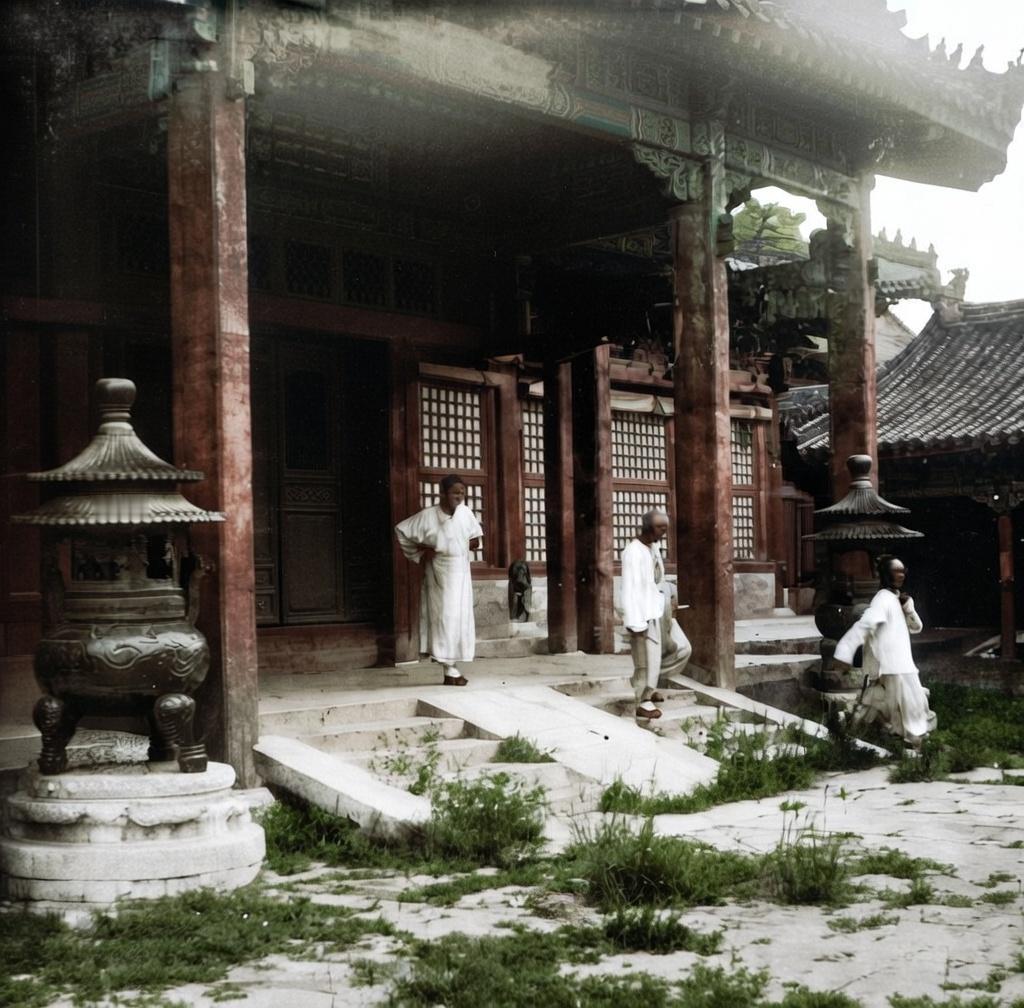1900—1901年,八国联军占领北京期间,紫禁城的一处宫殿庭院,这三位男子身着长袍,是慈禧太后和光绪帝西逃后,被留下看守皇宫的太监。他们正从宫殿的廊檐下走出,姿态随意。 庭院里杂草丛生,昔日规整的皇家禁地显得荒凉破败;两侧的铜制香炉虽在,却难掩萧瑟,尽显王朝末路的颓势。他们的身影在空旷的庭院中显得形单影只,这正是当时皇宫内人员稀少、皇权崩塌的真实写照。