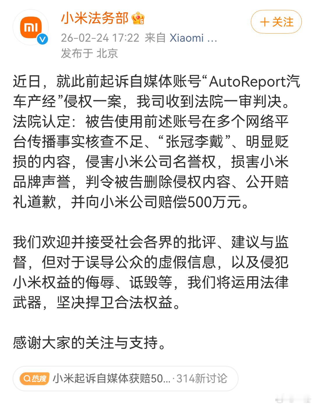 小米起诉自媒体获赔500万这个账号是易车的,易车算是个大公司,500万能赔得起,