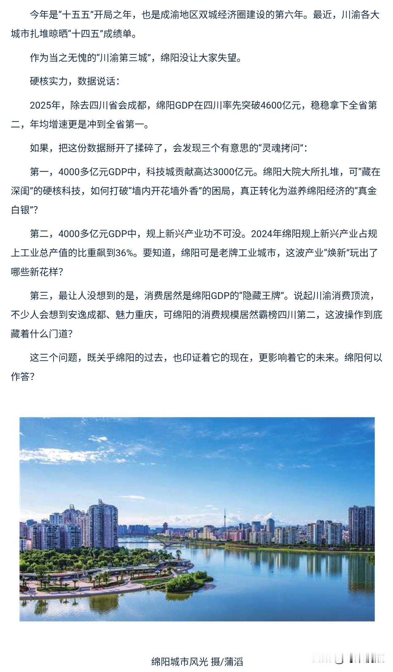 2月24日版《重庆日报》整版聚焦绵阳:“川渝第三城”破题三大“灵魂拷问” --绵阳市的经济发展得到重庆市权威报刊肯定 注:《重庆日报》属中共重庆市委机关报(省级党报),由中共重庆市委主管、主办 。该报1952年创刊,邓小平亲笔题写报名 ,是重庆地区覆盖面最广、权威性最强的综合性日报 。