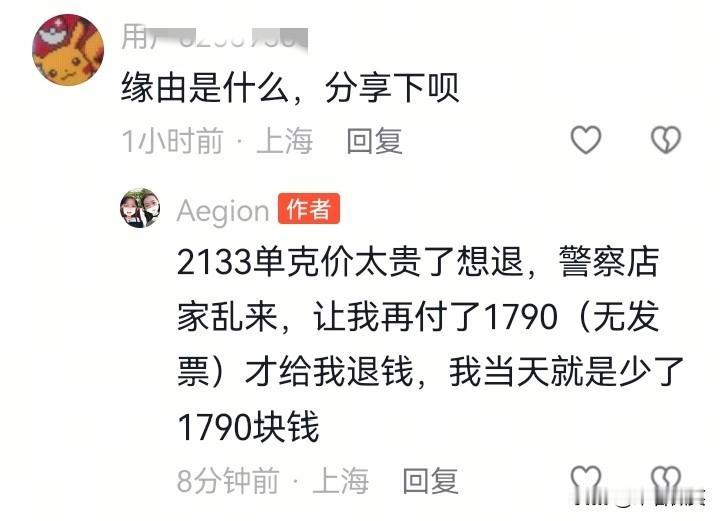 不是谁发视频谁就有理!上海的一个“小仙女”买了黄金首饰,后悔了去退款,金店不给她退,“小仙女”报警了,帽子叔叔来了之后也不向着“小仙女”,“小仙女”怒了,跟帽子叔叔吵架:你没用过POS机啊?POS机上点退款你不知道多简单! 叔叔告诉她:你老想着你简单,成年人买个东西要为自己的行为负责! “小仙女”不听:你别说我是成年人,我是消费者,我是弱势群体! 帽子叔叔都无语了:谁说消费者是弱势群体? “小仙女”很生气,拍了视频发到了网上,说自己2133元单克买的黄金太贵了,想退必须再付1790元,自己吃大亏了!