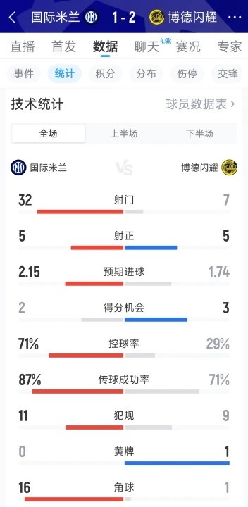 直播吧2月25日讯在欧冠淘汰赛附加赛次回合,国米1-2不敌博德闪耀。以下为双方全场数据对比:
