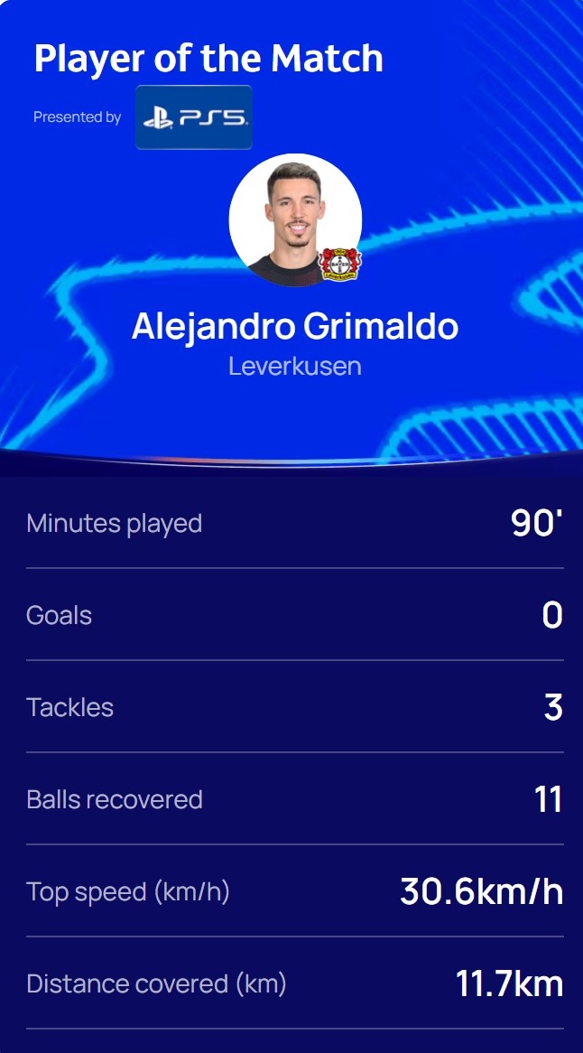 此役格里马尔多为勒沃库森踢满全场,11次夺回球权,他当选欧冠官方本场比赛最佳球员。