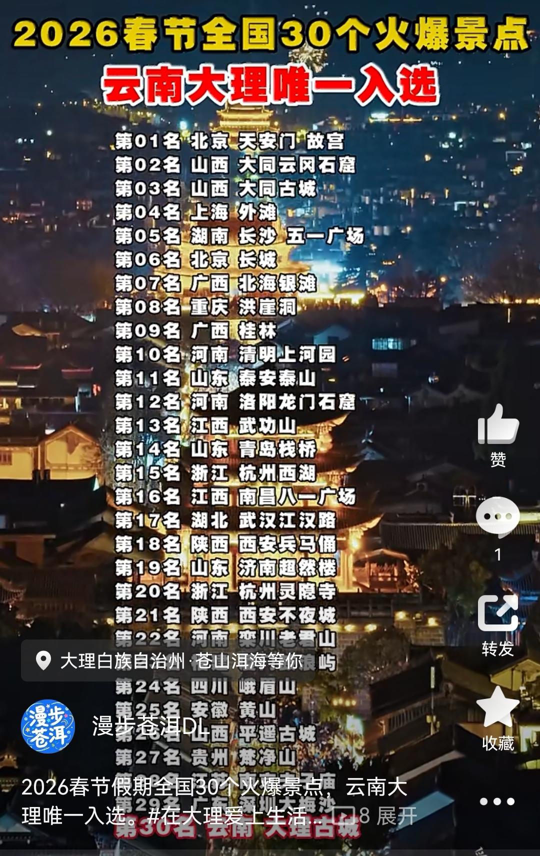 🔥🔥🔥春节假期大理州接待游客820.75万人次,旅游总花费92.22亿元。 春节去大理旅游真成大热门了!2026年春节假期,大理州那人气简直爆棚,接待游客多达820.75万人次,客运量都有126.23万人次。而且它还是全国30个火爆景点里云南唯一入选的。 九天假期,大理旅游总花费高达92.22亿元。单大理市就接待游客612.54万人次,旅游花费达68.82亿元。这么多游客和消费额,足以看出大理的年味有多浓,旅游市场有多火热。 这也说明大理的旅游魅力大,能让大家愿意在春节期间奔赴而来,尽情消费感受节日氛围。 大理旅游 来大理旅游 新春游大理 大理