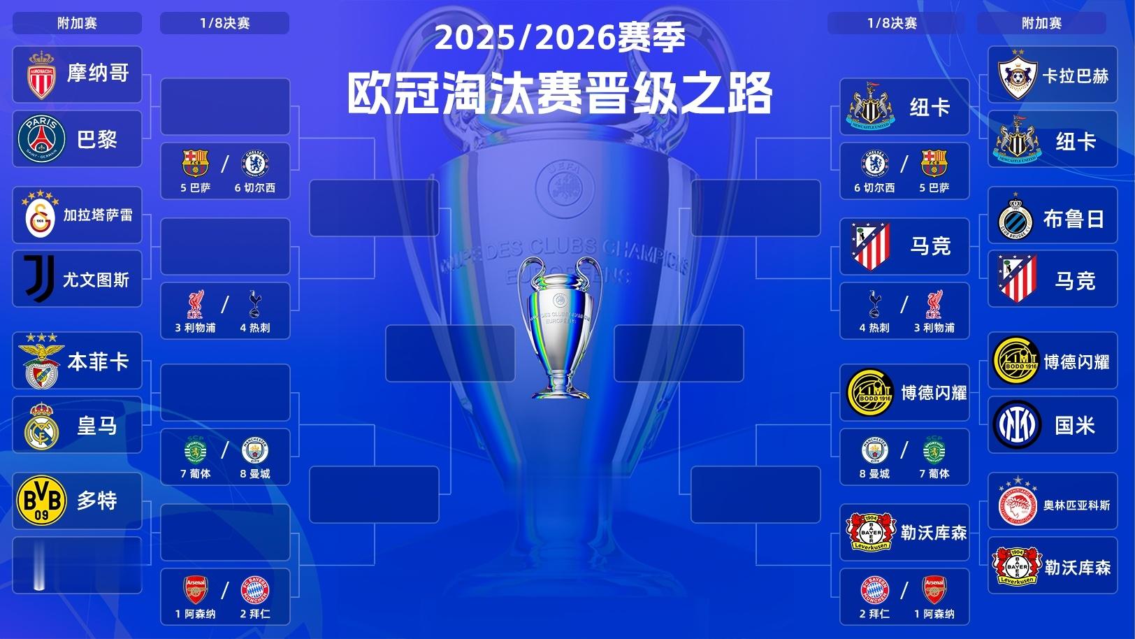 今日欧冠1/8决赛附加赛的4场比赛已经全部结束,马竞、博德闪耀、纽卡、勒沃库森成功晋级