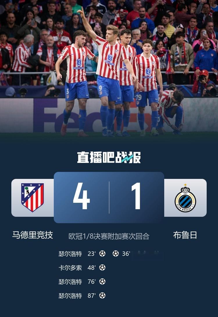 马竞4-1总比分7-4淘汰布鲁日,晋级欧冠16强!抽签将面对利物浦或热刺的其中之一。