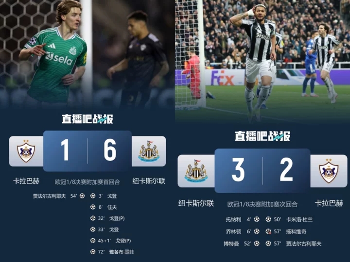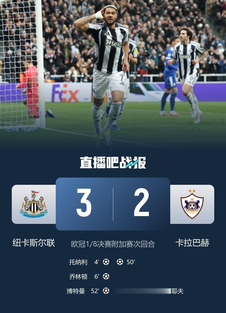 纽卡斯尔3-2击败卡拉巴赫,总比分9-3晋级,1/8决赛可能与切尔西或巴萨交手。