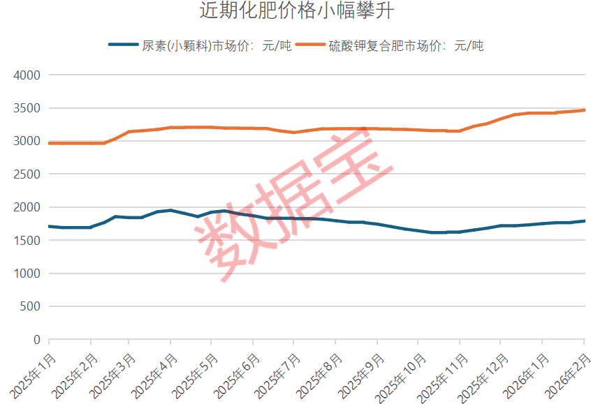国家统计局数据显示,截至2月10日,尿素(小颗粒)市场价为1783.8元/吨,较2025年年末上涨3.25%,较去年同期上涨5.24%;硫酸钾复合肥市场价为3458.9元/吨,较去年同期上涨16.9%。此外,据Wind数据,2月24日磷酸一铵(55%粉状)市场价3850元/吨,同比上涨16.67%。