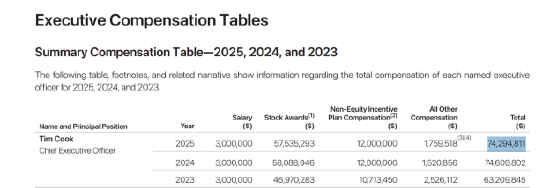 (图:股东会上公布的库克2025年确认年薪和上一年几乎持平。)