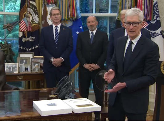 (图:2025年年中,库克曾向特朗普赠送一件刻有苹果标识的康宁玻璃摆件,镶嵌24K金底座。)