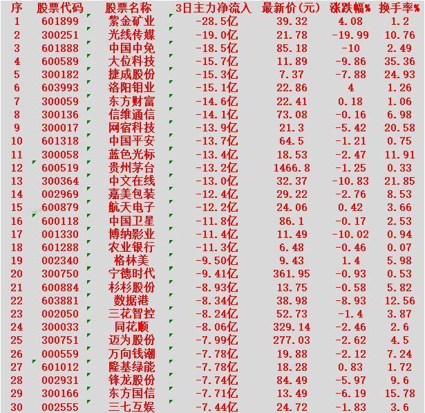 当心!2月25日,前3天主力大幅卖出的30名单 紫金矿业:3日净流出 28.5