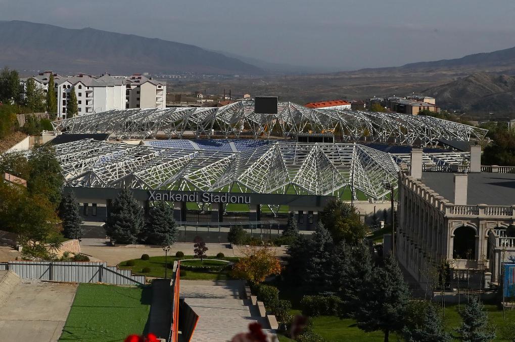 这是2025年10月15日在阿塞拜疆卡拉巴赫地区汉肯德市拍摄的建设中的汉肯德体育场。新华社记者陈俊锋摄
