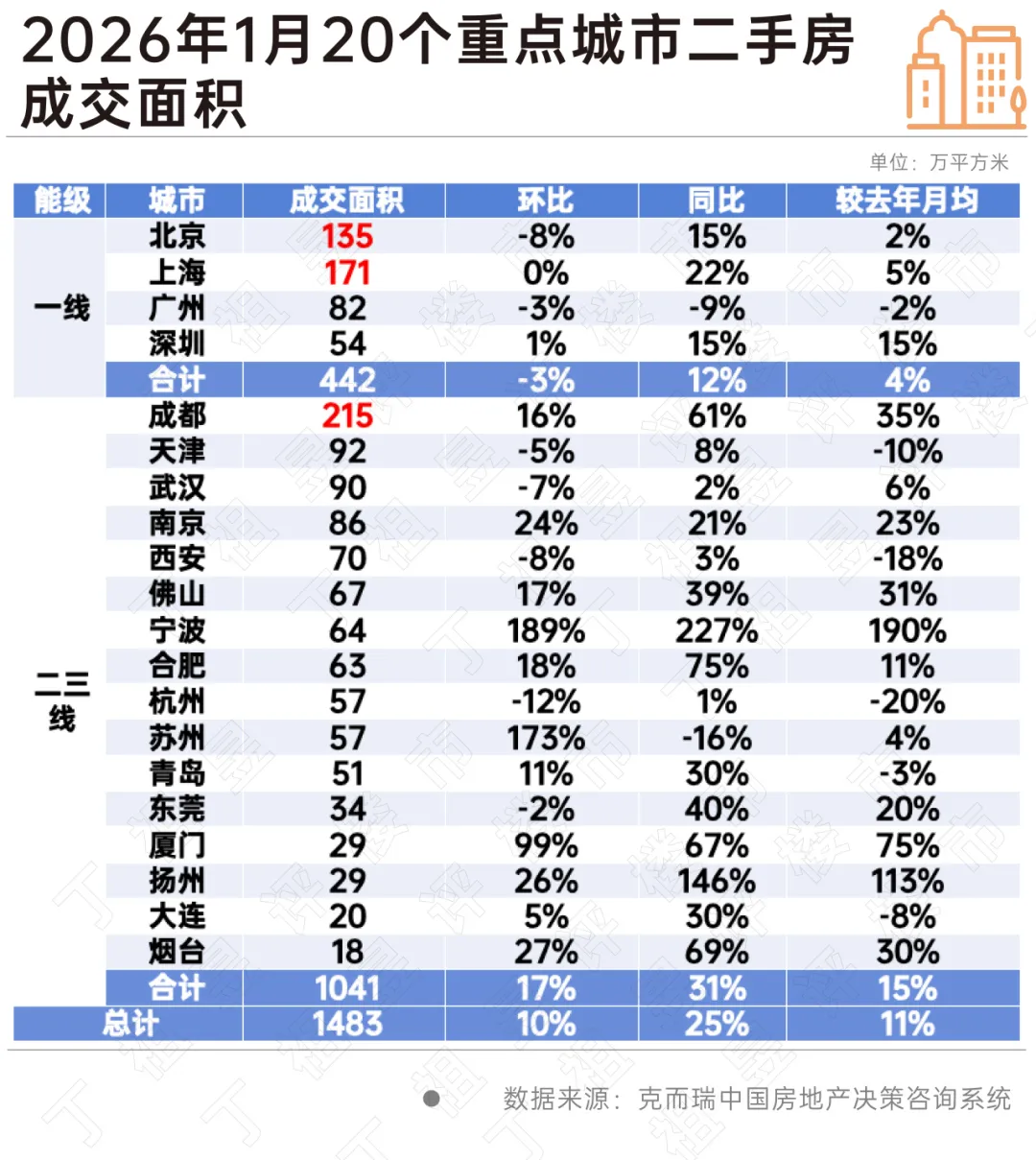 市场也在不断出现积极的信号。新房市场在供应约束下,整体仍处于“L型回稳”中。“二手房成交创新高”意味着需求仍然存在,2026年1月20个重点城市二手房成交实现“开门红”,成交面积环比上涨10%,部分核心城市挂牌量开始下降,惜售现象明显。全年二手房成交预计“先跌后稳”,而二手房企稳,正是市场底部确认的关键信号之一。