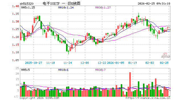 2月25日,电子50ETF(515320)开盘涨0.00%,报1.258元。电子50ETF(515320)重仓股方面,立讯精密开盘跌0.16%,寒武纪涨0.79%,工业富联涨0.78%,中芯国际涨1.02%,海光信息涨0.75%,北方华创涨0.23%,胜宏科技涨0.13%,京东方A涨0.23%,兆易创新跌2.18%,澜起科技涨0.01%。