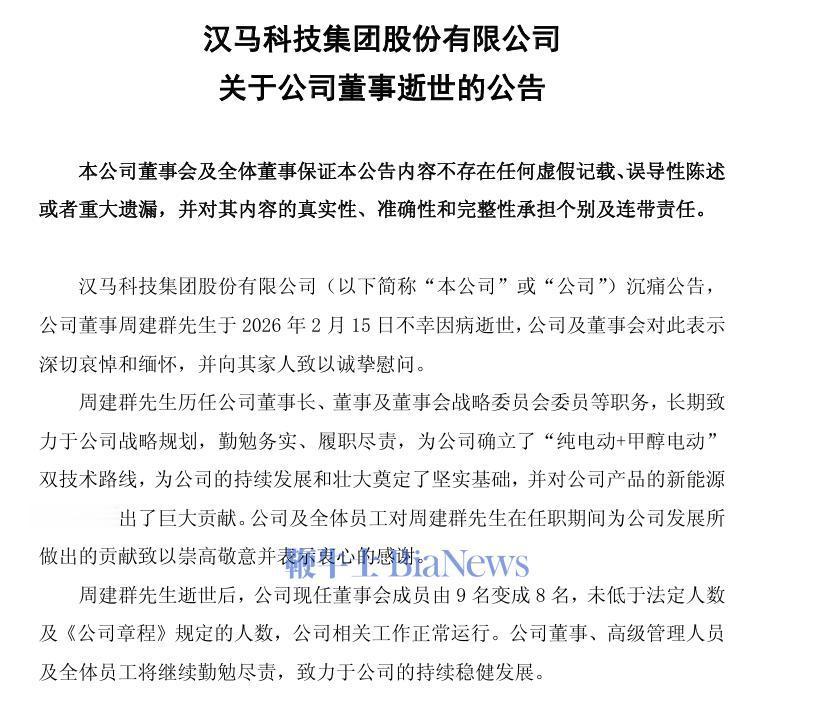 2月25日,昨日晚间,吉利控股旗下汉马科技发布公告称,公司董事周建群因病于2026年2月15日逝世,享年61岁。