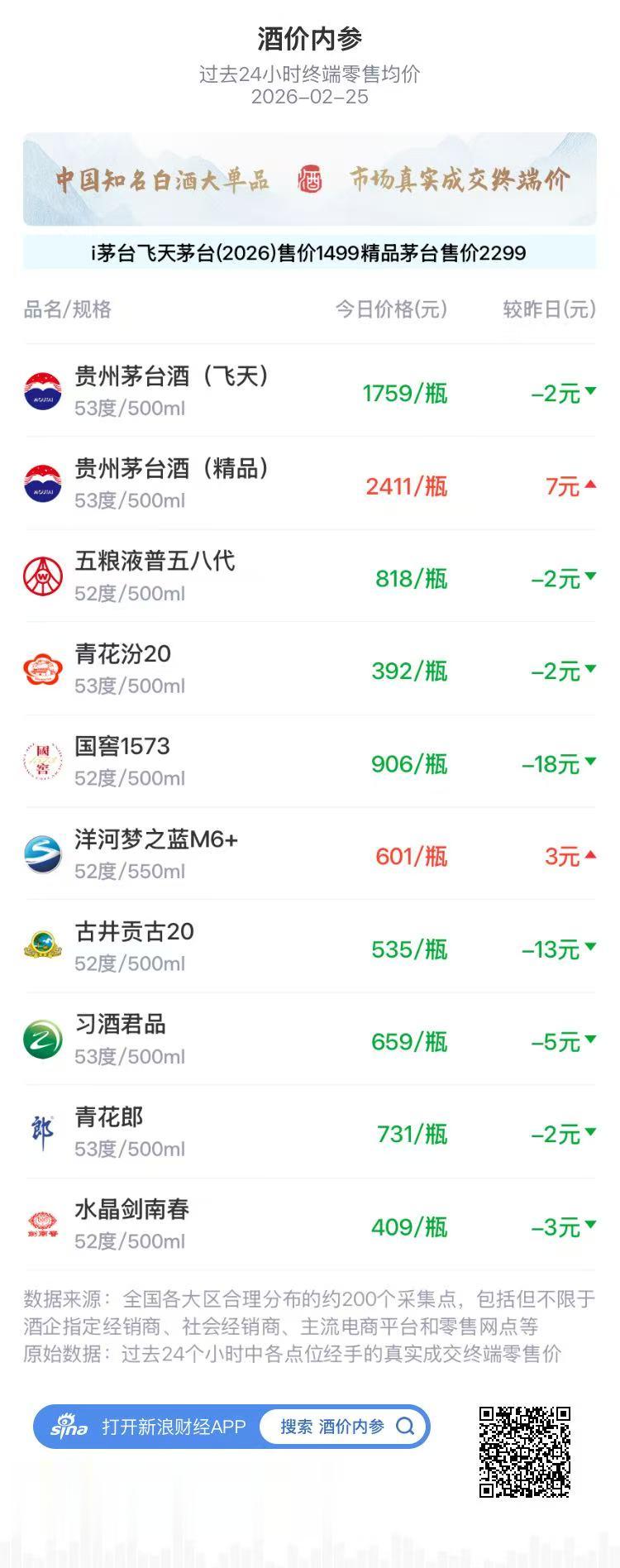 新浪财经“酒价内参”过去24小时收集的数据显示,中国白酒市场十大单品的终端零售均价在2月25日呈明显回调态势,春节假期涨幅领先的品种卖压较重。如果十大单品各取一瓶整体打包售卖,今日总售价为9221元,较昨日大幅下跌37元,创近一周以来新低。整体价格在前期高位整理后出现技术性回落,预计市场短期将继续承压。今日十大单品八跌两涨,市场情绪明显谨慎。上涨方面,精品茅台逆势上行,环比上涨7元/瓶,成为今日全场的主要支撑力量;洋河梦之蓝M6+小幅上涨3元/瓶,延续窄幅波动态势。下跌方面,国窖1573跌幅居前,下调18元/瓶,价格重心明显下移,此前该酒品刚经历五连阳;古井贡古20下跌13元/瓶,跟随回落;习酒君品回调5元/瓶。水晶剑南春下跌3元/瓶,飞天茅台、五粮液普五八代、青花汾20及青花郎均小幅回落2元/瓶。