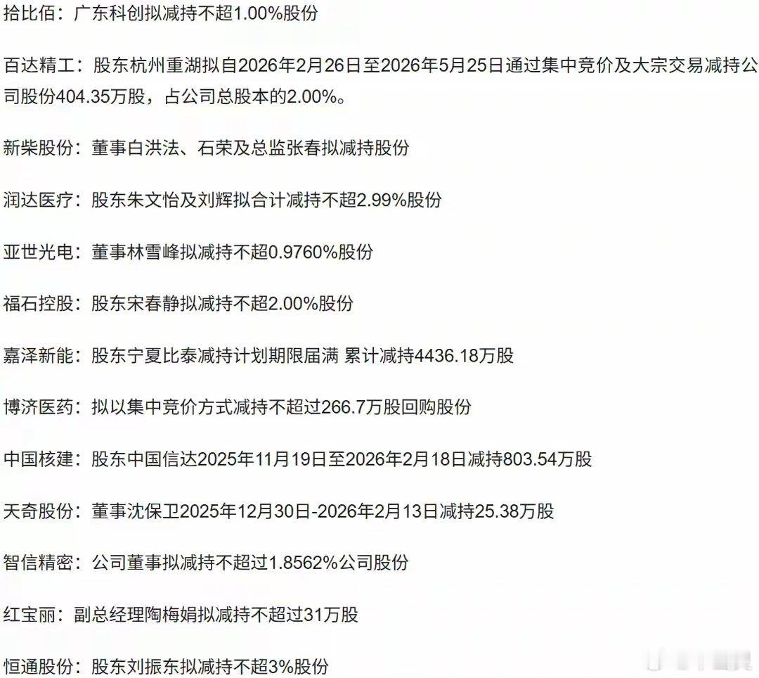 13家A股集体减持,光刻胶、核聚变、机器人三大热门赛道龙头遭砸盘!春节长假后首个交易日收盘,晚间直接炸出13家公司集中减持,不少还是近期爆炒的热门标的,短线情绪压力直接拉满。减持直接拉满。减持理由大多是“个人资金需求”,节后刚开盘,股东就忙着落袋为安。一、光刻胶热门龙头:红宝丽高管拟减持31万股。作为近两年光刻胶人气标的,该股从不足5元最高涨到13元,翻倍有余。年初再度从7元附近一路拉升至15元,节后第一天更是直接涨停。涨停当晚就抛减持公告,对短线追高资金明显偏利空。二、可控核聚变龙头:中国核建本次减持803万股,数量不小。好一点的是:本次减持已实施完毕。公司是本轮核聚变行情核心标的之一,主营核聚变相关工程建设。近期虽有回调,但较前期低点仍有较大涨幅。中国信达此次减持,主要是出于资金效率考虑。三、机器人人气龙头:天奇股份从去年12月底至今,累计涨幅超130%。股价连续大涨期间,高管同步减持25.38万股。不得不说,减持时点拿捏得相当精准。除此之外,晚间发布减持的还包括:智能电网方向的嘉泽新能、AI应用板块的福石控股等多家公司。完整减持名单附在下方,大家可以对照自查,规避短期风险。作品声明:个人观点、仅供参考