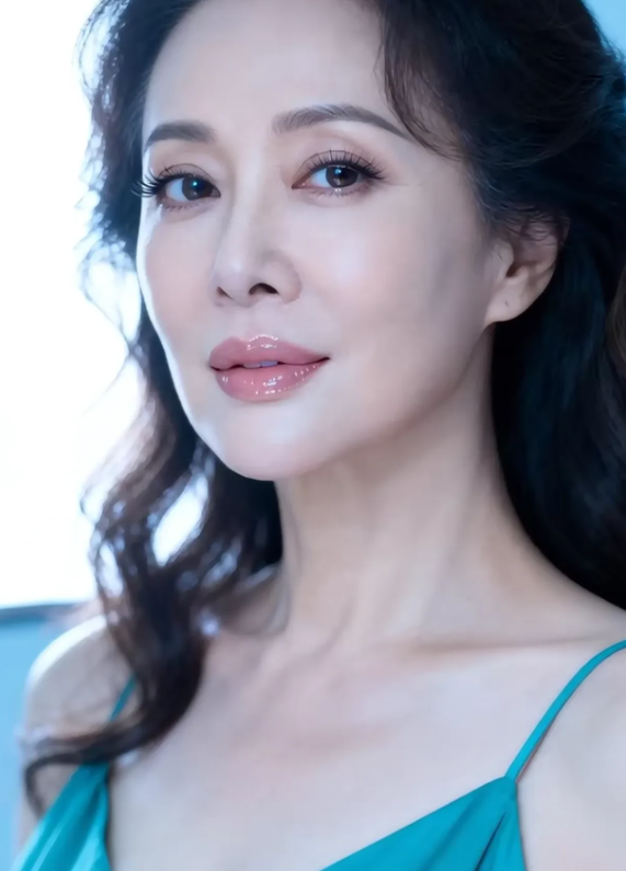 她的大波浪卷发蓬松有光泽 衬得脸庞愈发精致 眉眼间透着温婉大气,唇色莹润,身着湖蓝色吊带,尽显优雅从容,气质如兰,自带岁月沉淀的美感
