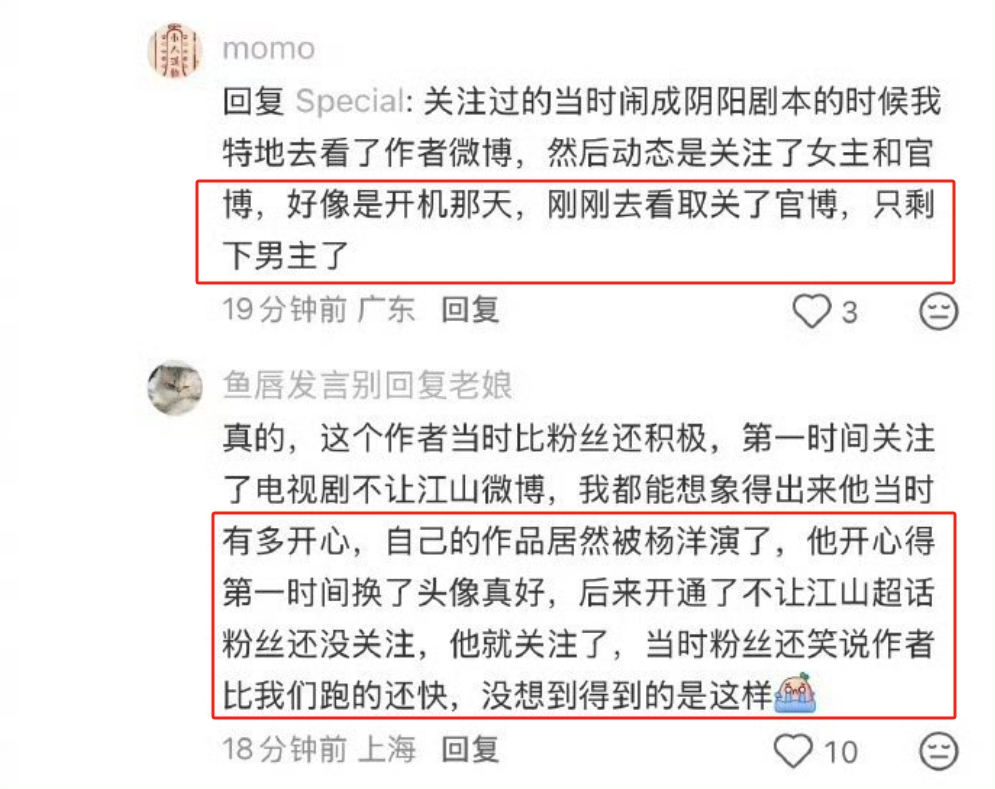 随后有网友发现《不让江山》的原著作者已经在开机发布会当天,取关了电视剧官博,关注只保留了杨洋,疑似是力挺杨洋。