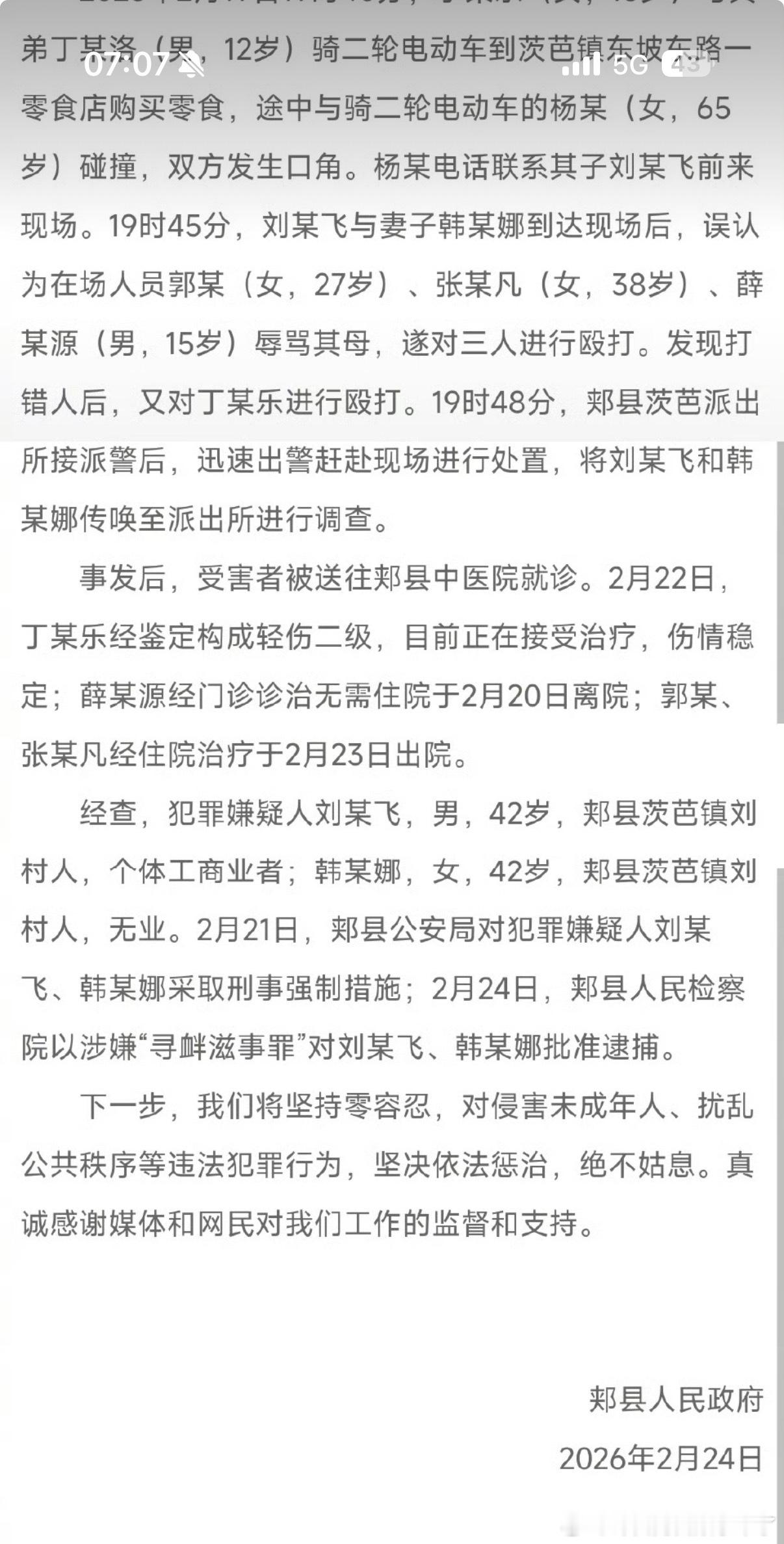 2月19日,因电动车碰撞起口角,刘某飞、韩某娜到场后误认并殴打4人,发现打错后仍殴打15岁的丁某乐。丁某乐22日苏醒,鉴定为轻伤二级。警方21日刑拘二人,24日检察院以寻衅滋事罪批准逮捕,案件正进一步办理。