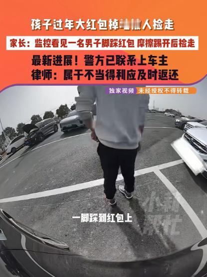 河南郑州,一位12岁孩子过年的1255元大红包掉了,后孩子妈妈通过车身监控看到,红包正好掉在了她家车旁边,且被一名男子捡走了红包。可见,男子发现红包时,先是用脚踩住红包,四下观察无人后便将红包捡走了。好巧不巧的是,这车身监控不但拍下了男子捡红包的全过程,还拍下来男子停在不远处的车以及陕西车牌号。于是孩子妈妈报了警,并在网上喊话,希望陕西的朋友看到之后能提供线索,让该男子归还孩子的红包。 春节假期的余热还没完全散去,不少小朋友还抱着自己攒了一整个新年的压岁钱,盘算着要买心仪的物件,可河南郑州一位刚满 12 岁的男孩,却在高速返程的途中,把自己攒下的 1255 元新年红包彻底弄丢了。 这本该是件让人懊恼又无奈的小事,可偏偏车上安装的停车监控,把红包丢失、被人捡走的每一个细节都拍得一清二楚,甚至连捡钱男子的车辆和外地车牌都完整记录下来,也让这件小事很快有了明确的进展。 这件事发生在 2 月 22 日,此时正处于春节假期的最后返程高峰时段,根据高速路段的实时流量数据显示,当天全国高速返程车流突破单日峰值,河南境内的连霍高速车流量更是比平日上涨近七成。 洛阳服务区作为沿线核心停靠站点,单日进出车辆超过一万辆,往来休息的乘客更是数不胜数。 郑州的聂女士带着自家 12 岁的孩子驾车途经此处,想着让孩子下车活动一下身体,缓解长途坐车的疲惫,孩子下车时动作匆忙又活泼,压根没留意到贴身放在上衣内袋的红包已经悄悄滑落。 这个红包里装的 1255 元,是孩子整个春节收到的全部压岁钱,由长辈们分次积攒而成,对十二岁的孩子来说,这是一笔分量十足的 “私房钱”。 原本孩子已经规划好用途,一部分用来购买新学期的学习资料和文具,一部分打算入手期待已久的运动器材,剩下的还想留着买喜欢的课外书籍,这笔钱承载的不只是金额,更是孩子整个新年的小期待。 等到孩子回到车上,伸手摸向口袋才发现红包不见踪影,瞬间就急得眼圈发红,翻遍了衣服口袋、随身小包,甚至把车内的储物格、座椅缝隙都找了个遍,始终没有看到红包的影子,满心的欢喜一下子变成了失落和慌张。 看着孩子难过的模样,聂女士没有过多责备,而是立刻想到了查看车辆自带的监控设备。 如今市面上超过七成的家用私家车,都会安装 360 度全景停车监控,这类设备能清晰覆盖车辆周边 3 到 5 米的范围,停车状态下也能自动记录周边画面。 聂女士调出监控录像后,很快就看到了红包掉落的完整过程,而后续出现的画面,也让整个事件的经过毫无保留地展现在眼前。 监控画面里,红包落在自家车辆旁的地面上,鲜艳的颜色格外显眼,没过多久,一名男子从对面方向缓步走过来,目光精准落在了地上的红包上。 让人意外的是,这名男子既没有大声询问失主,也没有站在原地等候,反而做出了一连串刻意的动作。 他先是慢慢靠近红包,不动声色地将脚踩在红包上方,用鞋底轻轻压住红包,还借着脚面的摩擦,把红包往路边更隐蔽的位置踢了踢,同时不停转动头部。 快速扫视周围的车辆和行人,反复确认没有任何人注意到这里的动静,在彻底放下戒备后,才迅速弯腰捡起脚下的红包,随手揣进自己的衣兜,转身快步离开,整个捡钱过程不过十几秒,动作连贯又刻意。 更关键的是,车载监控的拍摄范围足够全面,不仅完整记录下男子捡钱的所有动作,还清晰拍到了他停在不远处的私家车,以及车辆尾部醒目的陕西籍车牌号,车牌上的每一位字符都拍摄得十分清楚,没有任何模糊遮挡,这也成了寻找线索最关键的依据。 发现这一线索后,聂女士没有选择在网络上过度发酵,而是第一时间拨打报警电话,向洛阳当地警方完整提交了监控视频、事发时间、具体地点以及涉事车牌信息,希望通过正规途径帮孩子找回遗失的红包。 这段监控画面在网络上传播后,很快引发了不少网友的关注,大家都在关注事件的后续处理,而警方的处置效率也十分迅速。 警方接到报案后,凭借清晰的陕西籍车牌信息,通过交管系统快速核查车辆登记信息,仅仅花费数小时就成功联系上了涉事车辆的车主。 但车主却拒不归还红包,即便失主承诺可以给200左右的红包当做答谢,车主在铁证如山的情况下依旧选择不归还,如今这起事件还在调查中。 其实生活中类似遗失财物的情况并不少见,以往很多时候因为没有清晰的证据,遗失的钱财很难找回,而这次正是依靠普及度越来越高的车载监控,才让整个过程有据可查。 对于这件事,您有什么想说的吗?欢迎评论区留言讨论。 信源:小莉帮忙2026-02-24——《2月24日(发布),河南洛阳,孩子过年大红包掉地被人捡走,家长:监控看见一名男子脚踩红包……》