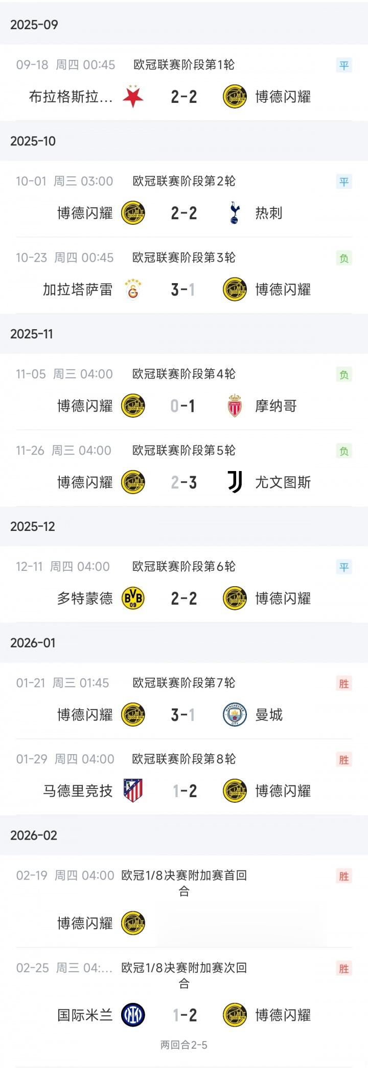 博德闪耀本赛季欧冠的签运很差,他们在联赛阶段遇到的8支队伍有6家是五大联赛球队:热刺、摩纳哥、尤文、多特、曼城、马竞。另外两家分别是捷克豪门布拉格斯拉维亚和土超班霸加拉塔萨雷。但他们还是完成了逆天而行的战绩:前5轮2分→8轮后9分,绝境翻盘。
