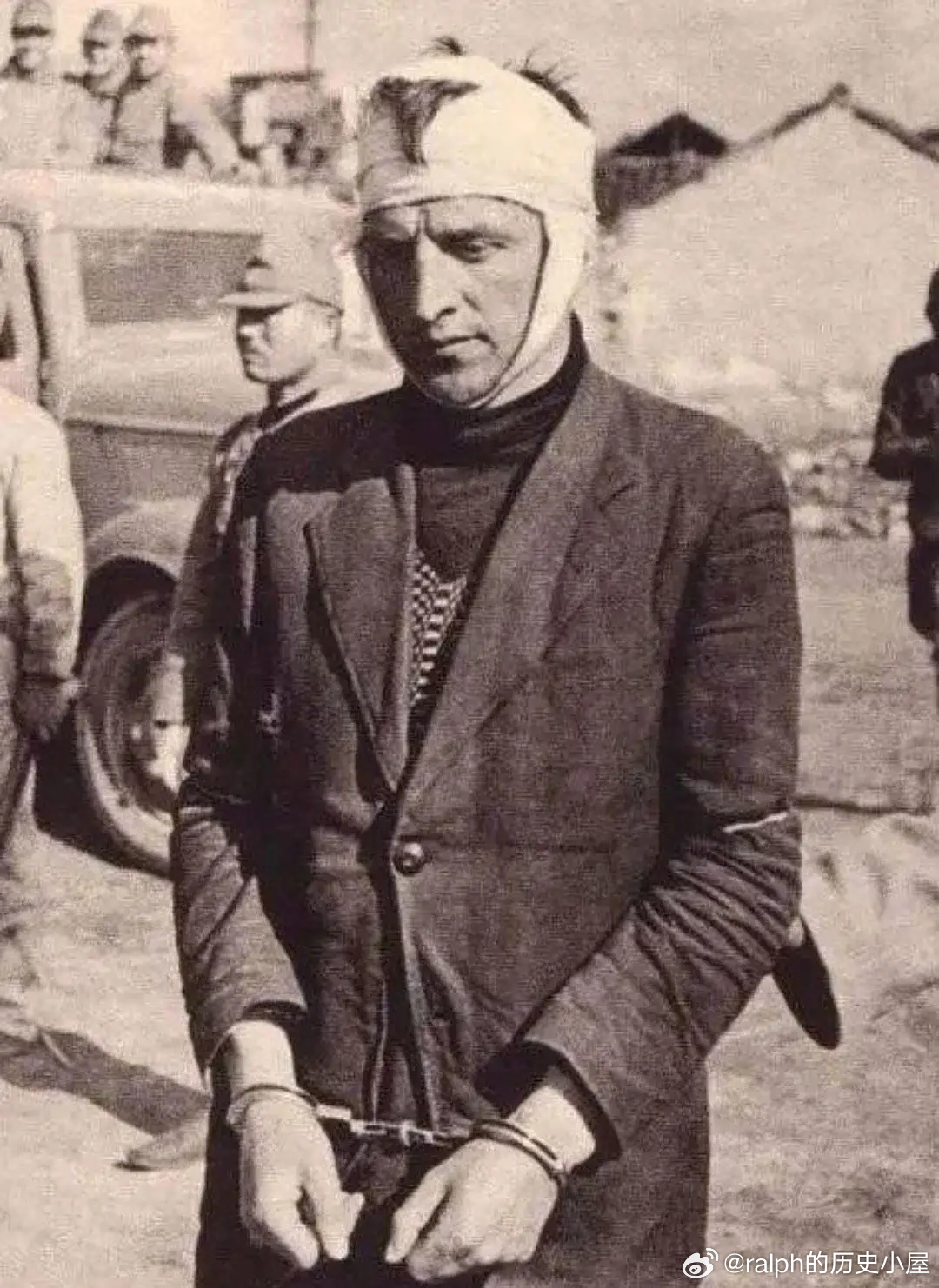 前两张图是抗战时期日军俘虏的苏联援华志愿航空队人员,网上多称这是1938年7月18日南昌空战被俘的苏军飞行员,名为瓦伦丁-多多诺夫。实际情况是当天飞行员В.Я.Додонов多多诺夫击毙日军海军航空队号称“四大天王”之一的王牌飞行员南乡茂本大尉,他跳伞获救但飞机坠毁。这两张图反映的情况则是1938年3月14日苏军1架斯勃侦察机在芜湖被击落,飞行员Павел Васильевич Муравьев 穆拉维约夫中尉和领航员Иван Николаевич Кущенко 库岑科中尉遇难,坐在射手位置的二级军械师Михаил Андреевич Домнин多姆宁(1907.10.22-1969.4.11)跳伞逃生后被俘。他在列宁格勒完成高级航空技师-工程师课程后1937年10月来到中国,3个月后获得红星勋章。他成为首位落入日军手中的苏联顾问。日本特勤部门长期审讯多姆宁,试图弄清苏联参与冲突的程度。根据苏联时期的书籍记载,他被处决了,但事实并非如此。1939年哈勒钦河战役结束后,日方曾试图交换他,但直到1945年8月17日才成功获释。在狱期间,他精通了日语(后来担任日语翻译),用两块木板和牙刷制作了微型国际象棋,每天坚持锻炼。