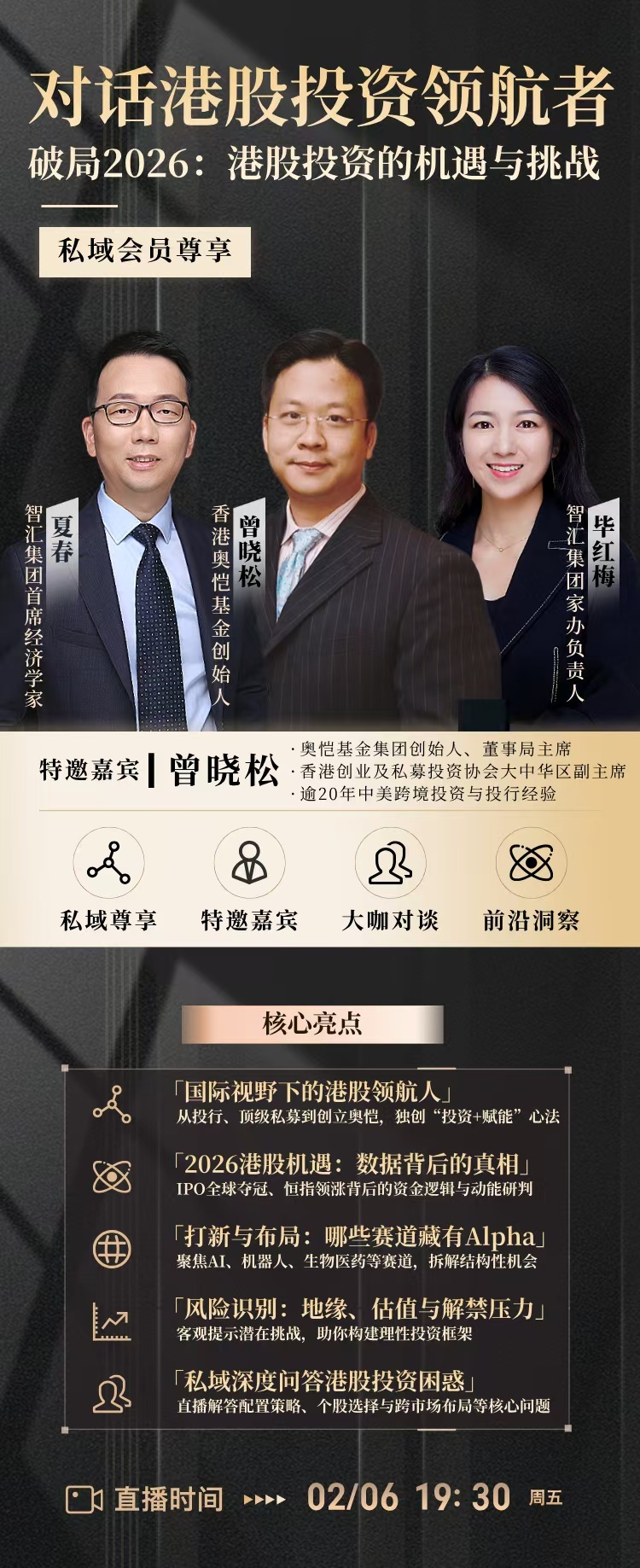 最近的会员私享直播(每月两场)与外部财经对话。会员专享直播可以通过在视频号主页商品栏加入会员(年费3980)收看