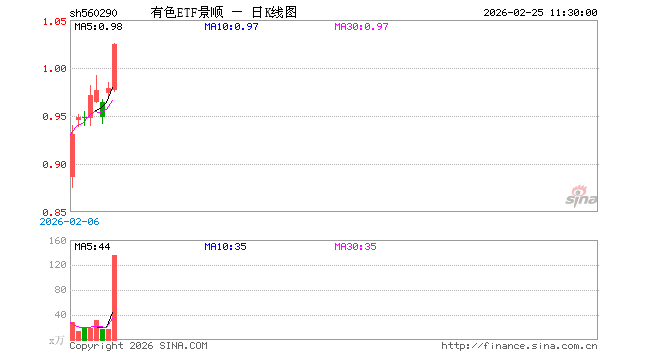 2月25日,截止午间收盘,有色ETF景顺(560290)涨4.70%,报1.025元,成交额1.38亿元。有色ETF景顺(560290)重仓股方面,紫金矿业截止午盘涨2.19%,洛阳钼业涨4.11%,北方稀土涨9.99%,中国铝业涨5.94%,华友钴业涨6.55%,中金黄金涨2.35%,山东黄金涨1.42%,兴业银锡涨4.38%,赣锋锂业涨2.94%,铜陵有色涨3.99%。