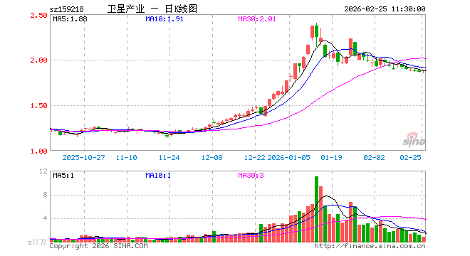 2月25日,截止午间收盘,卫星产业ETF(159218)涨0.70%,报1.880元,成交额1.47亿元。卫星产业ETF(159218)重仓股方面,中国卫星截止午盘涨1.02%,航天电子涨1.58%,中国卫通涨0.92%,中科星图涨0.84%,臻镭科技涨0.85%,华测导航涨1.05%,北斗星通涨1.08%,国博电子涨0.49%,北方导航涨0.29%,新雷能涨4.44%。
