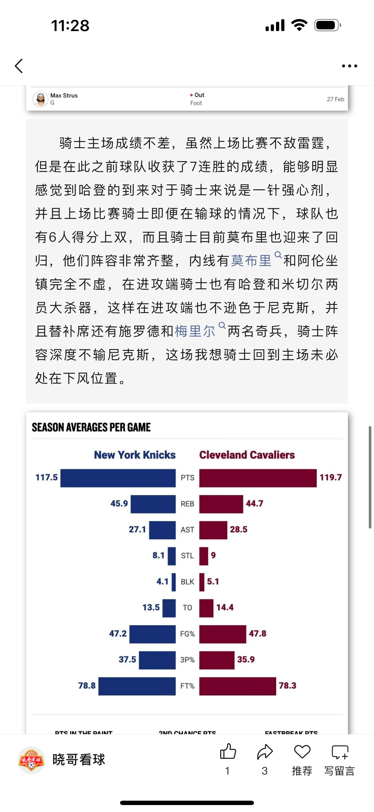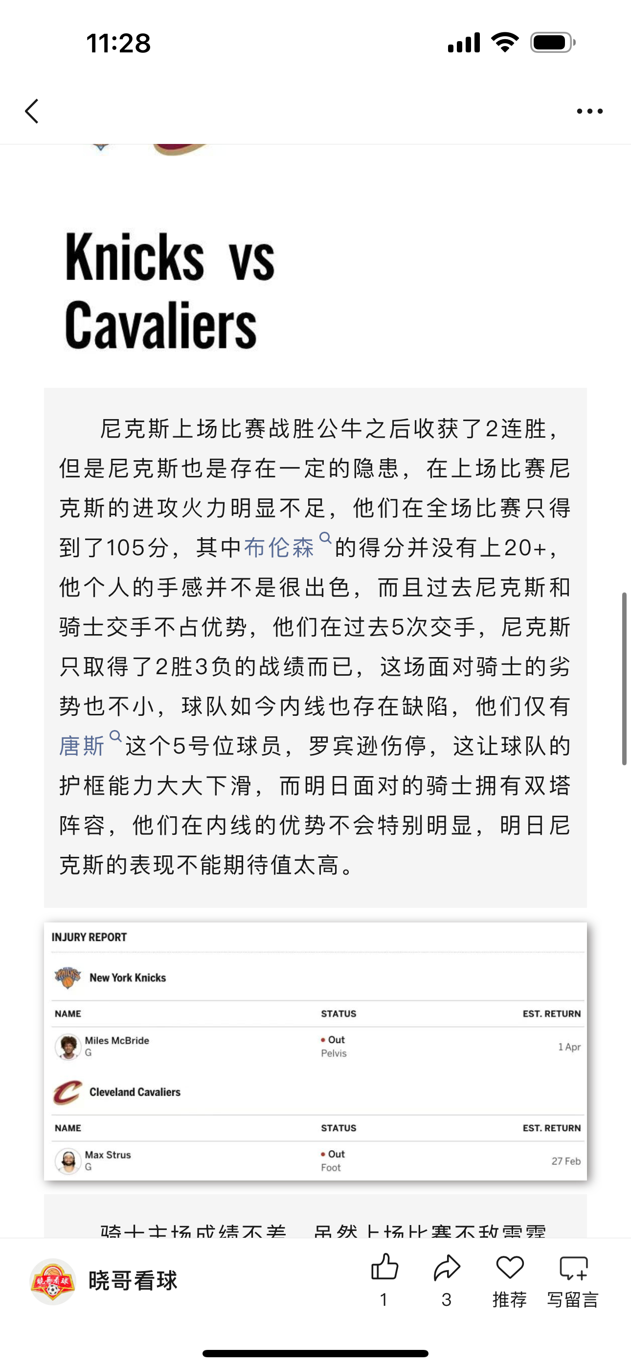 篮球公推骑士收获好评,篮球公推新春回归第一弹就收获好评成绩,这场主要还是对于尼克斯进攻能力缺陷的精确把控,全场尼克斯只得到94分,面对骑士内线强而有力的内线围剿,唐斯仅仅得到14分,这就是我在析文中提到骑士内线配置不输尼克斯的主要原因,这场合理好评!篮球NBA尼克斯