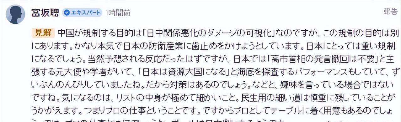 2月24日,日本教授富坂聪“一眼就看透了”中国的管制措施,他说:“中国不是在‘报复’,而是在精准‘踩刹车’,日本现在的表现太悠闲了,应该注意到中方给日本留下来‘谈判通道’。” 可能很多人还不清楚,2月24日中方出台的管制措施具体是什么,其实这份措施有着明确的针对性和严谨性,并非盲目管控。 根据中方商务部当天的官方回应,此次管制主要分为两部分,一部分是将三菱造船株式会社等20家参与提升日本军事实力的实体列入管控名单。 禁止向这些实体出口两用物项,也禁止境外组织和个人将中国原产的两用物项转移给这些实体,正在开展的相关活动也需立即停止。 另一部分则是将斯巴鲁株式会社等20家无法核实两用物项最终用户、最终用途的日本实体列入关注名单。 对这些实体出口两用物项时,将实施更严格的审查,不得申请通用许可,申请单项许可时还需提交风险评估报告和书面承诺,确保两用物项不被用于提升日本军事实力的用途。 很多人不明白什么是“两用物项”,简单来说,就是既可以用于民用领域,也可以用于军事领域的物品和技术。 中方管控这类物项的出口,核心目的就是制止日本的“再军事化”和拥核企图,这一点中方也在当天的回应中明确提及,强调相关措施完全正当、合理、合法。 而富坂聪之所以能“一眼看透”中方的意图,和他长期研究中日关系、关注中国发展有着密切关系。据悉,富坂聪一直以来都对中国的发展有着深入的了解。 此前也曾多次接受采访,解读中国的相关政策,他始终坚持客观公正的立场,不被片面言论影响,此次解读中方管制措施,更是精准抓住了核心。 他在采访中进一步提到,中方的“踩刹车”,踩的是日本不断推进“再军事化”的脚步,踩的是可能破坏地区和平稳定的苗头,并不是要破坏中日之间的正常经贸往来。 事实上,中方也明确表态,此次措施仅针对少数日本实体,仅针对两用物项,对于诚信守法、不涉及军事用途的日本实体,完全不会受到影响,这也正是中方留下“谈判通道”的体现。 反观日本方面,在中方出台管制措施后,不少日本政客纷纷发声,有的表示“遗憾”,有的甚至发出不实指责,却很少有人静下心来,认真解读中方的意图,也没有关注到中方留下的“谈判通道”。 这也是富坂聪觉得日本“表现太悠闲”的原因——没有真正重视中方的警示,也没有意识到自身行为带来的影响。 值得一提的是,中方留下的“谈判通道”并非一句空话,此次被列入关注名单的日本实体,只要履行配合核查的义务,就可以申请移出关注名单。 商务部核实后会依法将其移出,这也给相关日本实体提供了改正的机会,也给中日双方通过沟通解决问题留下了空间。 随着富坂聪的表态走红,越来越多的人开始重新解读中方的管制措施,也逐渐明白中方并非“报复”,而是以合理合法的方式,维护地区和平稳定,守护自身的核心利益。 毕竟中日一衣带水,保持健康稳定的中日关系,不仅符合两国人民的根本利益,也有利于地区和世界的和平与发展。 事实上,富坂聪此前就曾在采访中谈及中国,他认为在当前世界发展遇到瓶颈的时刻,中国式民主或许是一剂良药,可见他对中国的发展有着客观且深入的认知,这也让他此次的解读更具说服力,不盲目跟风,不刻意抹黑,只用事实和理性,点透中方措施的本质。 中方不主张对抗,提倡睦邻友好、用对话的形式解决分歧。若日方不珍惜这次机会,接下来的限制名单可能会越来越长,到时候日本连“装悠闲”的资本都没有。