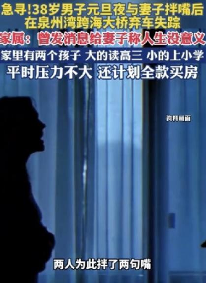 压倒骆驼的最后一根稻草。 福建泉州,一38岁男子回到家里,立刻就想上床休息,谁知被妻子拦住,要他先洗脚再上床,为了这点小事,俩人发生了吵架,男子一气之下,开车来到了跨海大桥,他打开双闪,将车停在应急车道,他给妻子发了条消息:“人生没有意义。” 2026 年 2 月 21 日,泉州湾跨海大桥的应急车道上,那辆白色轿车依旧静静停放,车身上的灰尘已被海风拂过一层又一层 —— 它的主人张某,已经失联整整 50 天。 这场跨越寒冬的搜寻,耗尽了家人的心力,也揭开了一个中年顶梁柱不为人知的生存困境,更藏着许多被忽略的细节,引人深思。 不同于寻常失联案件的扑朔迷离,张某的离去,更像是一场早已埋下伏笔的 “无声告别”。 警方介入调查后,除了现场遗留的车辆,还发现了一个关键细节:他的手机里,没有任何与工友、家人的争执记录,唯独最后一条微信,字字沉重,发给家人:“人生没有意义”。 很少有人知道,这个 38 岁的河南汉子,在泉州打拼的 20 年里,一直默默扛起家庭的重担。 18 岁孤身南下时,他从底层做起,在工地辛苦谋生,住过工棚,省吃俭用,哪怕再苦再累,也从未向家里抱怨一句。 后来,他学了手艺、考了驾照,日子渐渐有了起色,却也始终保持节俭 —— 不抽烟、不喝酒,不乱花钱,每月工资大多用于家庭开支,自己用的也是旧手机。 他的节俭,源于沉甸甸的家庭责任。 家中年迈的父母需要照料,读高三的大儿子面临高考,上小学的小儿子正是长身体的时候,都需要开支。 由于夫妻二人常年在泉州打工,孩子和老人留在河南老家,张某承担着家里主要的经济压力,他常对工友说:“我苦点累点没关系,只要孩子能上好学,父母能安度晚年,就够了。” 生活的重压,一点点累积在他身上。 那段时间,他情绪明显低落,常常发呆、走神,工作时也显得疲惫不堪,心里藏着太多压力与无助,却很少跟家人倾诉。 悲剧的发生,定格在 2026 年 1 月 1 日深夜。 当天张某结束一天的工作,回到住处后,因生活小事与家人发生了短暂争执,情绪彻底崩溃。 他没有再多说一句话,转身拿起车钥匙,驾车离开了出租屋,最终停在了泉州湾跨海大桥的应急车道上,留下了那场无声的告别。 张某失联后,家人和警方的搜寻从未停止。 他的弟弟从外地连夜赶来,自费请人使用无人机在泉州湾海域搜寻,年迈的父亲不顾路途遥远,从河南老家赶来,每天沿着海岸线徒步寻找,逢人就打听儿子的下落,眼神里满是绝望。 唯一的线索,来自一位路过的网友,他称 1 月 2 日凌晨 3 点左右,曾看到这辆亮着双闪的轿车停在应急车道上,当时以为是车辆故障,并未多想,如今回想起来,才意识到事情的不寻常。 如今,张某的家人终日活在自责与悔恨中,反复念叨着:“我从来不知道他压力这么大,要是我当时多体谅他一点,他就不会走了。” 可世界上没有后悔药,再多的自责,也换不回那个默默扛着整个家的男人。 这起悲剧,并非孤例。 现实中,不少家庭顶梁柱常年辛苦劳作,默默承受压力,一旦情绪崩溃,就可能酿成无法挽回的后果。 这些案例都在警示我们:中年人的崩溃,从来都不是一瞬间的冲动,而是日复一日的辛劳、无人理解的委屈,一点点积压而成。 截至 2026 年 2 月 21 日,张某已经失联 50 天,搜寻工作仍在继续,家人依旧在原地等待,期盼着奇迹的出现。 泉州湾的海风依旧凛冽,那辆静静停放的轿车,仿佛在诉说着一个中年男人的无奈与绝望。 愿海风能带来一丝线索,愿这个未归的顶梁柱能有消息;更愿每一个家庭,都能多一份体谅与关心,少一份苛责与争吵,别让沉默与疏离,成为压垮亲人的最后一根稻草,别让平凡的日子,酿成无法挽回的遗憾。 如果各位看官老爷们已经选择阅读了此文,麻烦您点一下关注,既方便您进行讨论和分享,又能带来不一样的参与感,感谢各位看官老爷们的支持!