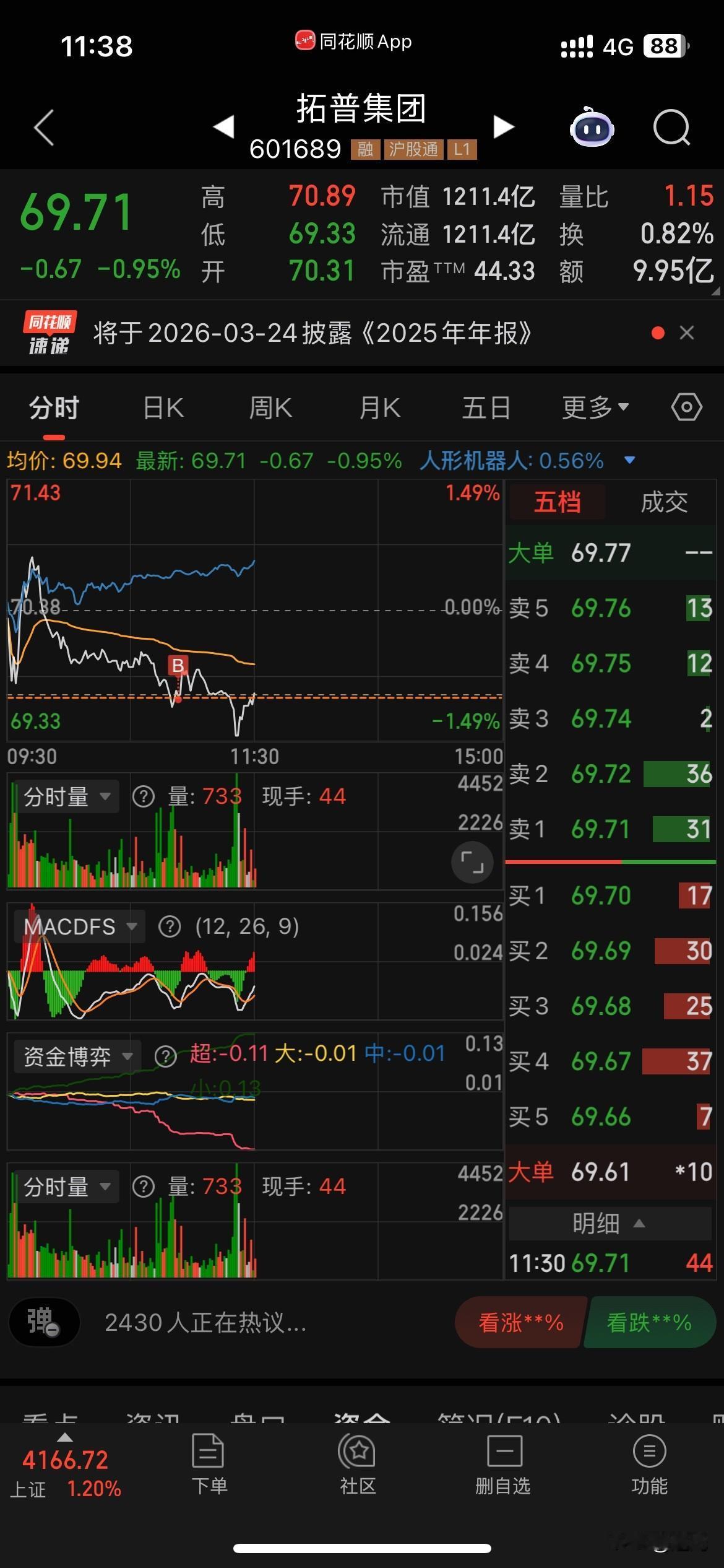 上午大盘高举高打,然而成交量萎缩明显,我有点怕,卖了盈峰和雅克,低位进了点拓普。盈峰已经清仓,目前手上股票全绿,微红几百块。春节期间热门的板块机器人和AI应用都一蹶不振,严重打击了开市追进的散户。月底我依旧趋于谨慎,维持20%小仓位,确保月度盈利。另外一个专做ETF的东财账户今年也是连续保持月度盈利。