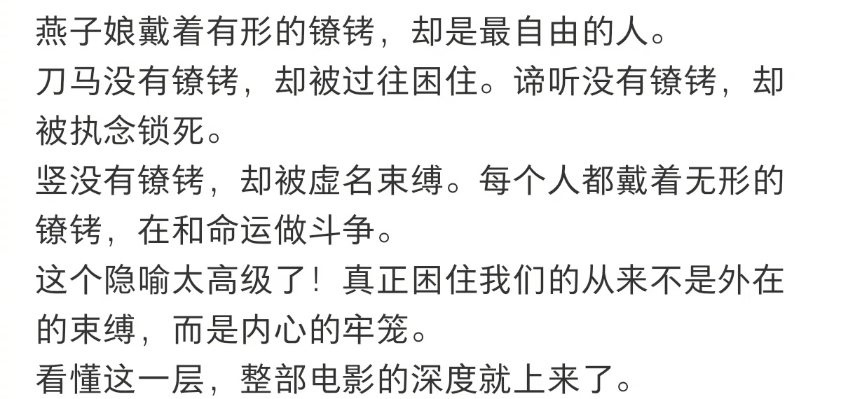 镖人的思想还是太超前了追 完 《 镖 人 》久 久 走 不 出 来,越 品 越 戳心 —— 原 来 每 个 人 身 上,都 锁 着 一 副 看 不 见 的 枷 锁 。我 们 以 为 的 自 由,不 过 是 在 命 运 里,挣 扎 着反 抗 。燕 子 娘 身 上 有 形 的 镣 铐 ,何 尝 不 是 我 们 的 缩 影 ?有 人 困 于 过 往,有 人 缚 于 执 念 ,有 人 囿 于 身 份 与 责 任 。明 明 拼 了 命 想 挣 脱 ,却 被 无 形 的 丝 线 牢 牢 捆 住 。