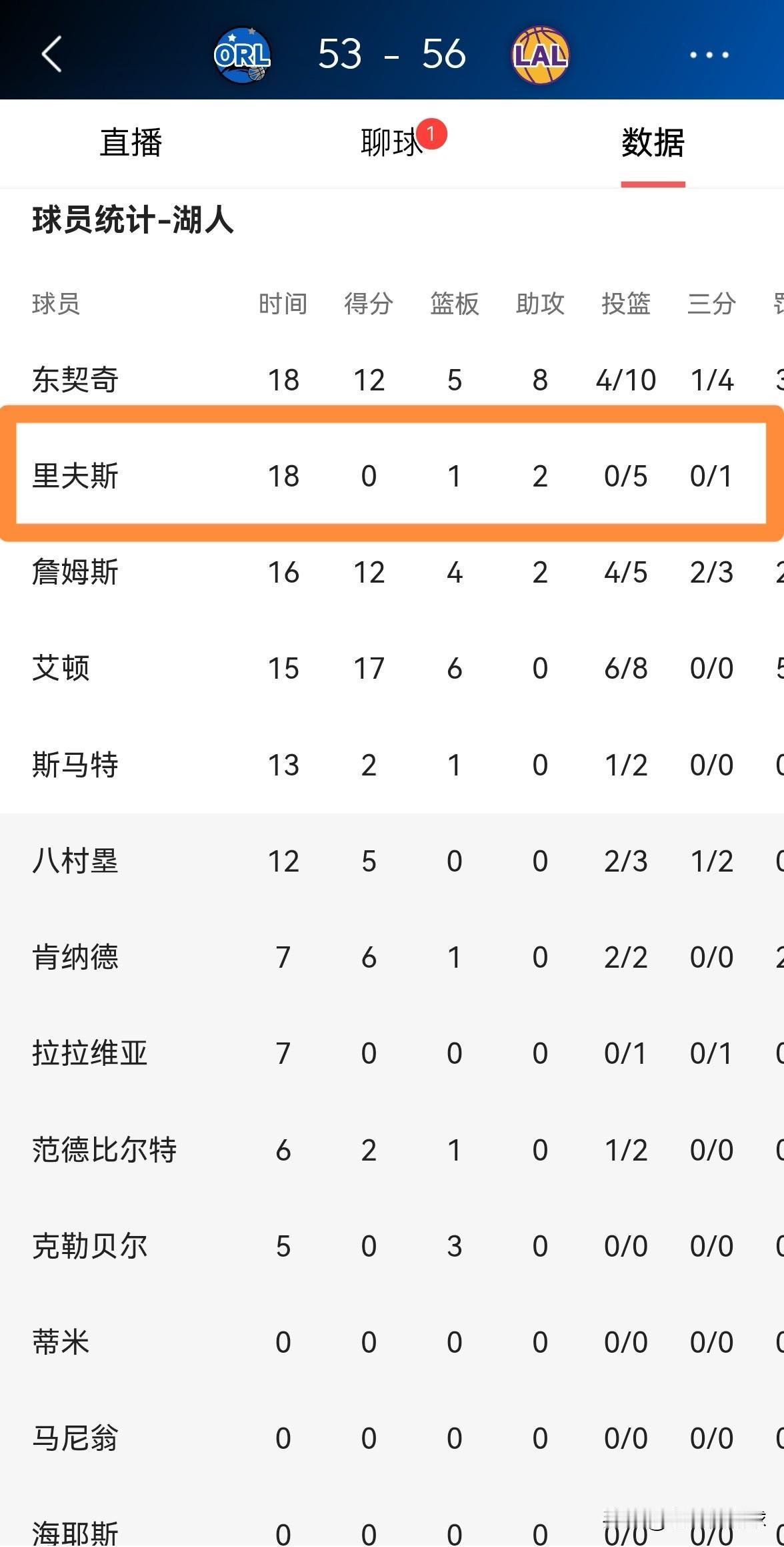 我忍不住要怒喷湖人三当家里弗斯!在今天进行的湖人和魔术的比赛中,目前双方的上半场比赛已经结束,虽然湖人以56:53领先对手3分,但是里弗斯的表现却极其的糟糕。 在前两节比赛中,里弗斯首发出战18分钟,投篮5中0怒砍0分,他的场上正负值为-2。 作为湖人的进攻核心之一,里弗斯在上半场比赛中的表现真是让人失望透顶,试问里弗斯凭什么向湖人索要一份顶薪合同?