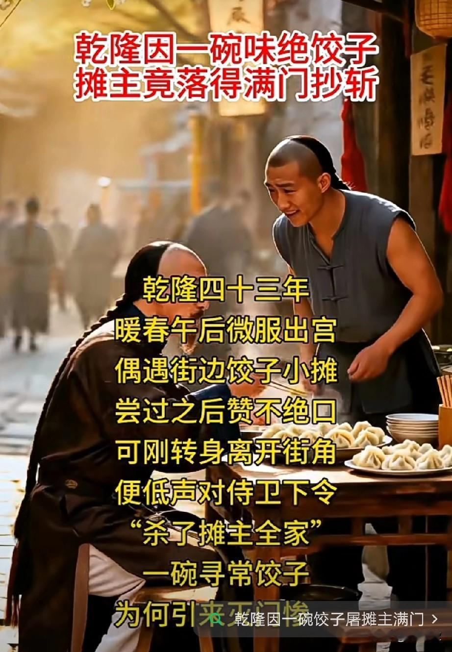乾隆也太狠了吧? 乾隆因为一碗味绝饺子 摊主竟落得满门抄斩 乾隆微服出巡路边吃饺子, 谁料摊主一家惨遭灭门! 乾隆四十三暖春午后微服出宫 偶遇街边饺子小摊 尝过之后赞不绝口。 刚转身离开街角 便低声对侍卫下令, 杀了摊主全家。 一碗寻常饺子 为何迎来灭门惨案?