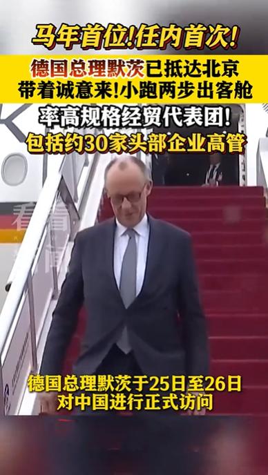 2月25日德国总理抵达北京,默茨妻子未同行;他也是春节后首位访华的贵宾,专机落地北京,接待人员早已准备好,舷梯上的红毯格外惹眼。 不管怎样,来者都是客,北京为了迎接默茨,做足了准备,毕竟中国人热情好客,希望德国总理也能体会到中方的用心。 其实,默茨启程北京前就已经表态,希望与中方真诚合作,访华行程公开,的确是奔着合作来的,期间他将参观故宫,结束北京行程后还将前往杭州访问宇树科技,可惜默茨夫人没有来,如果夫妻俩一起访华有个伴也不会孤单啦。