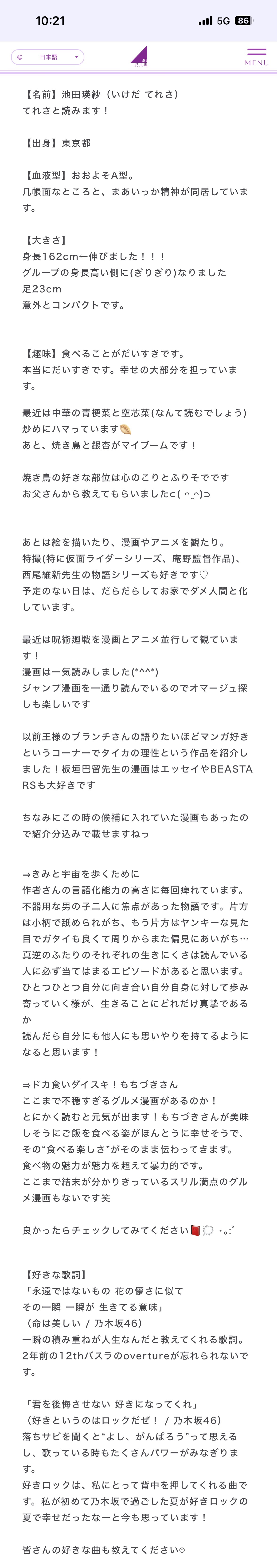 池田瑛紗「自己紹介します!今日は、改めて乃木坂46のこと、5期生のこと、そして私のことを知っていただけたら嬉しいなと思ってブログを書いています。少しでも私のこと、そして私が大切にしているものを知ってもらえたら嬉しいです。」