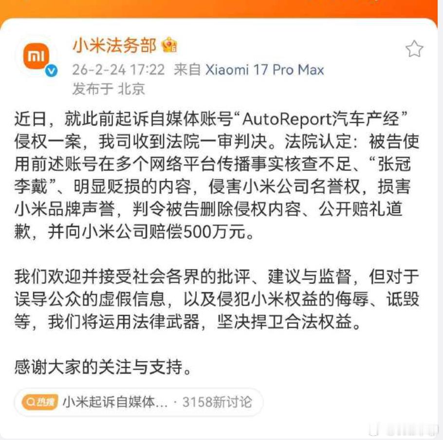 autoreport汽车产经,一审被判赔偿小米500万。