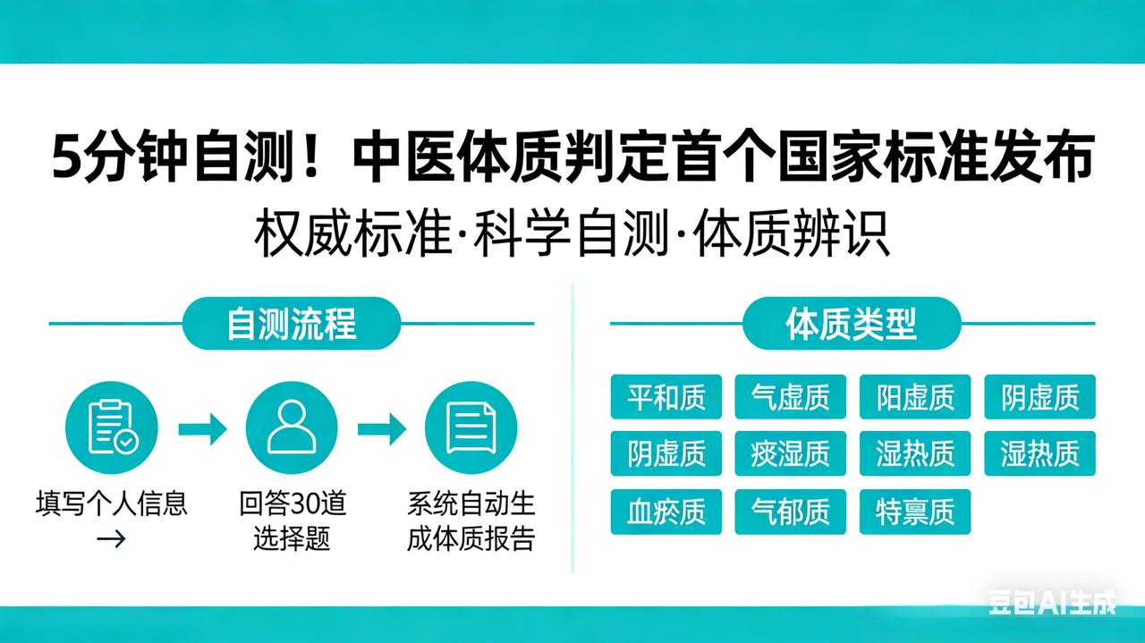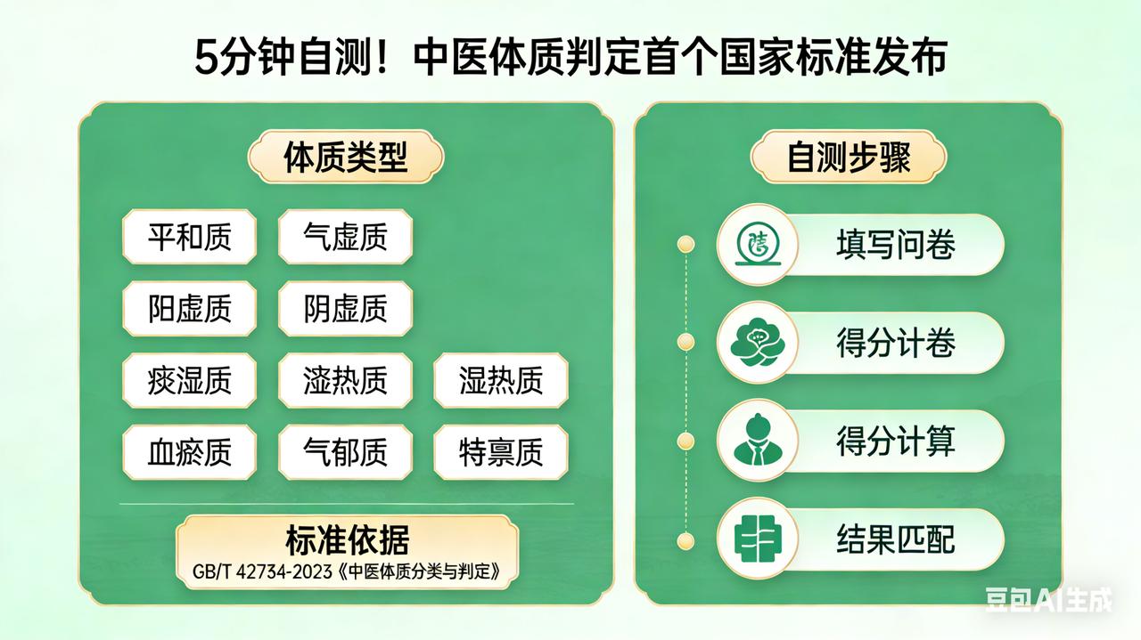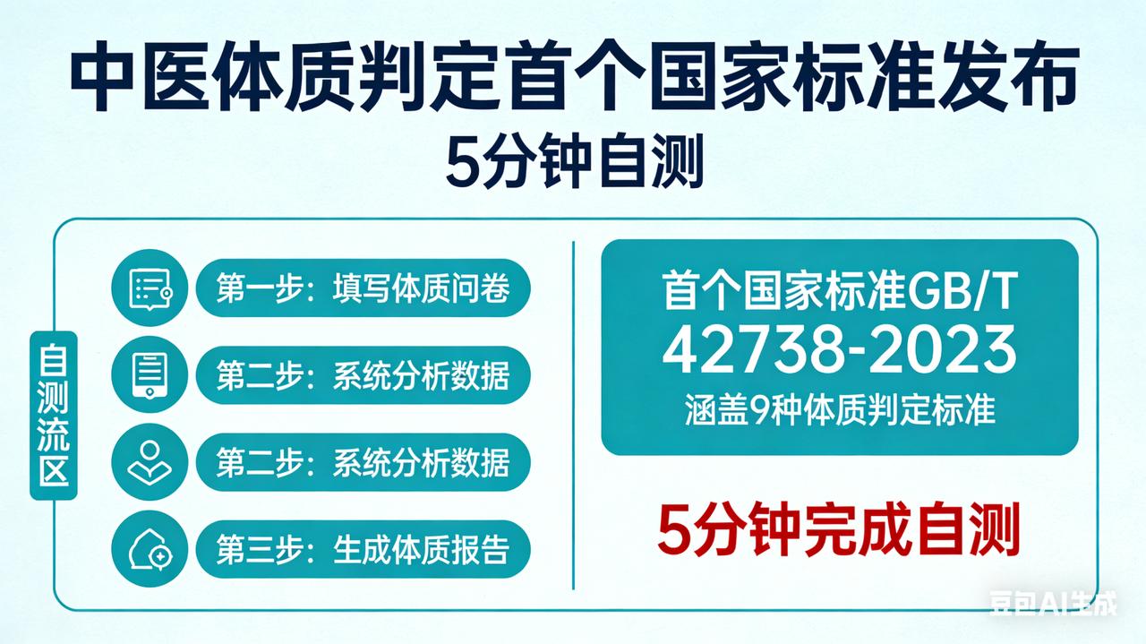5 分钟自测!中医体质判定首个国家标准发布 规范“治未病”:中医体质判定首个“国标”璀璨启幕 在中医源远流长、博大精深的发展长河中,近日迎来了一则具有划时代意义的喜讯——中医体质判定领域首个全国统一的《中医体质分类与判定》推荐性国家标准正式闪耀登场。这一“国标”的横空出世,宛如一场及时雨,为中医“治未病”理念的科学实践注入了强大动力,照亮了其前行的康庄大道,提供了坚实且无可撼动的支撑。 中医体质,恰似一幅绚丽多彩、细腻入微的人生画卷,是人体在先天禀赋与后天获得的双重影响下,精心雕琢而成的涵盖形态结构、生理功能、心理状态以及适应能力等多个维度的综合且相对稳定的固有特质。它被巧妙地划分为平和质、气虚质、阳虚质等九种基本类型,每一种类型都如同独特的音符,在人体健康的交响乐中奏响着别样的旋律。 曾几何时,体质判定犹如在茫茫迷雾中艰难探寻方向,很大程度上依赖医生的个人经验。这就好比在波涛汹涌的大海中航行,没有精准的罗盘指引,极易迷失方向,出现偏差,导致判定结果不够精准。这使得“治未病”这一古老而充满智慧的理念,如同被束缚了手脚的舞者,难以充分发挥其应有的作用,无法为人们的健康提前筑牢坚固的防线。而此次“国标”的出台,恰似一把精准无误的标尺,为体质判定提供了统一、规范的标准。医疗机构可以参照其中明确界定的9种体质类型特征以及分类判定方法,如同拥有了清晰无误的地图,能够开展更为精准、科学的体质判定服务,让“治未病”有了坚如磐石的可靠依据,真正实现了防患于未然,将疾病扼杀在萌芽状态。 这一“国标”并非凭空而生,而是有着深厚的实践沃土和历史积淀。早在2009年,以王琦院士及其团队建立的九种体质分类学说为基石,中医体质辨识便被纳入国家基本公共卫生服务规范,如同在中医健康事业的大地上播下了一颗希望的种子,开启了中医体质研究的新篇章。同年,中华中医药学会发布了《中医体质分类与判定》团体标准,这颗种子在行业内生根发芽,初步在中医领域达成了广泛的共识,为中医体质判定的发展奠定了坚实的基础。这一团体标准在实践中得到了广泛的应用,如同春风化雨,滋润着中医健康事业的土壤,覆盖了全国1700余家二级以上中医医院的治未病科室,基层医疗卫生机构累计应用更是超过5.7亿人次,为无数人的健康撑起了一把保护伞。 此次发布的国家标准是在团体标准的基础上“提档升级”,宛如一次华丽的蜕变和完美的升华。它采用了更为简便、高效的体质采集、辨识与判定工具,量表条目数量大幅减少,平均填写时间由原来的11.6分钟缩短至4.23分钟。这一改进看似微小,却意义重大,如同为体质辨识的推广应用打开了一扇便捷之门,降低了应用的门槛,提高了效率。它有利于在公共卫生服务、健康体检、个人自测等众多场景中广泛推广应用,让中医体质判定走进千家万户。它推动着中医“治未病”从传统的经验模式迈向规范化的科学模式,让更多人能够受益于科学准确的体质判定与调理,拥抱健康美好的生活,开启中医健康新时代,为人类的健康事业贡献中医智慧和力量。