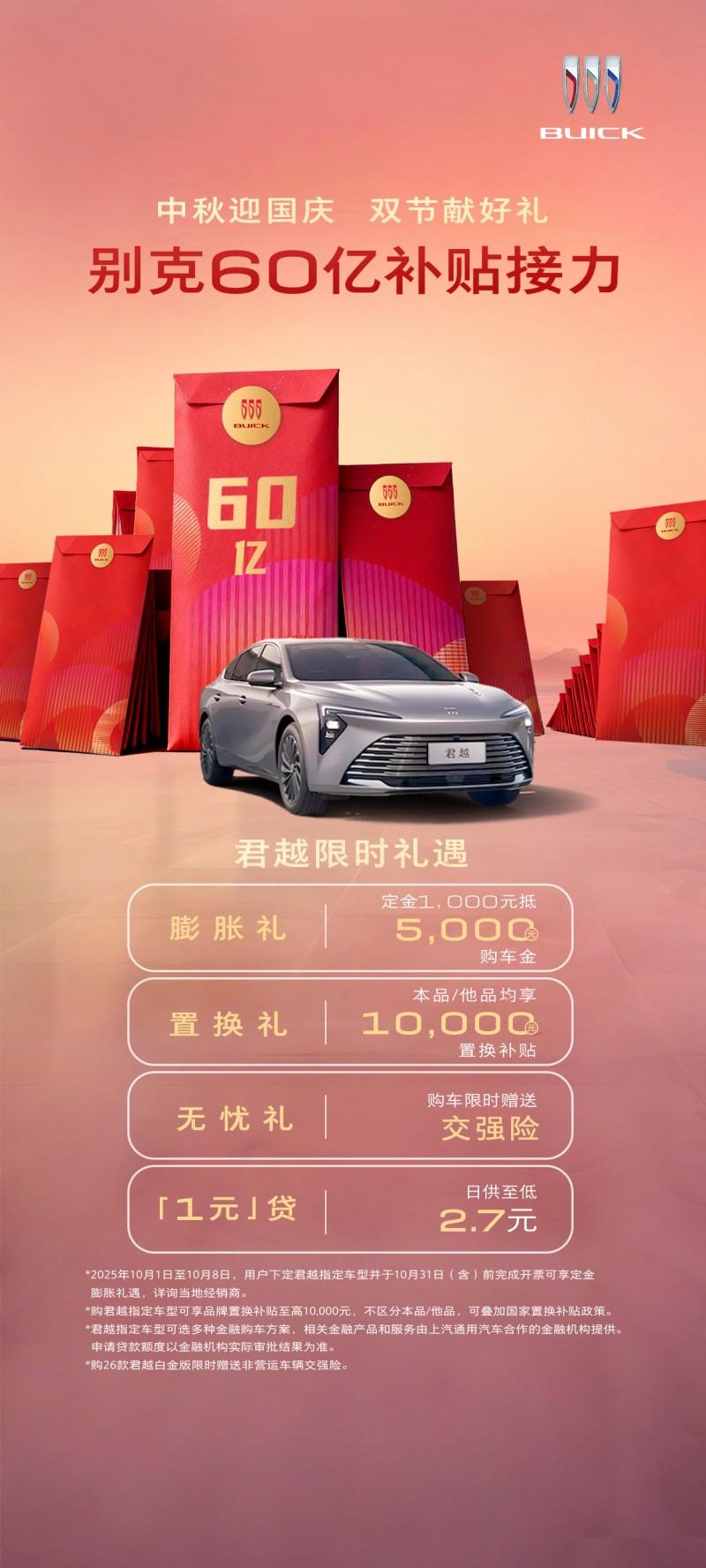 十月购车季来临,汽车市场迎来新一轮促销热潮。别克品牌豪掷60亿超级红包启动“补贴接力”活动,以真金白银的福利覆盖多款车型。购买昂科威 Plus、昂科威 S、君越(指定车型)、君威、GL8 陆尚、威朗、微蓝 6 等热门车型,限时享“1000 元抵 5000 元”购车膨胀金;同时,购买别克纯电 E5 先享版,限时至高享“1000 元抵 15000 元”超级膨胀金;购买别克纯电 E5 智享版,限时免费获赠一款限量版炫色车衣。此外,购车更可享受至高 25000 元置换补贴。26款昂科威Plus遵循"多10%"造车理念,在性能操控、舒适空间、智能体验及安全品质四大维度展现卓越实力,正是别克对品质的无限追求,昂科威Plus才能创下2025年单月11,841辆的销量新高,同比环比双双增长。该车型新增"寰宇紫"专属内饰配色,标配前排吸风式座椅通风和行车记录仪等配置,真正做到"标配即满配"。君越作为豪华舒享座驾,已赢得超过130万用户信赖,26款君越全系配备别克V5.0车机系统,新增丹霞墨韵双拼内饰配色,并将方向盘加热、前排座椅按摩、副驾老板键等豪华配置作为全系标配,诠释"入门即豪华"的驾乘理念。感兴趣者可访问别克官方平台获取完整活动信息。别克这次来真的狂撒60亿红包补贴 别克E5零自燃