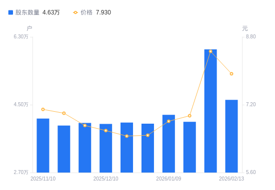 近一年(2025年2月20日至2026年2月13日),泰山石油A股股东户数从3.68万户,增加至4.63万户,增幅25.92%,区间股价上涨41.00%。